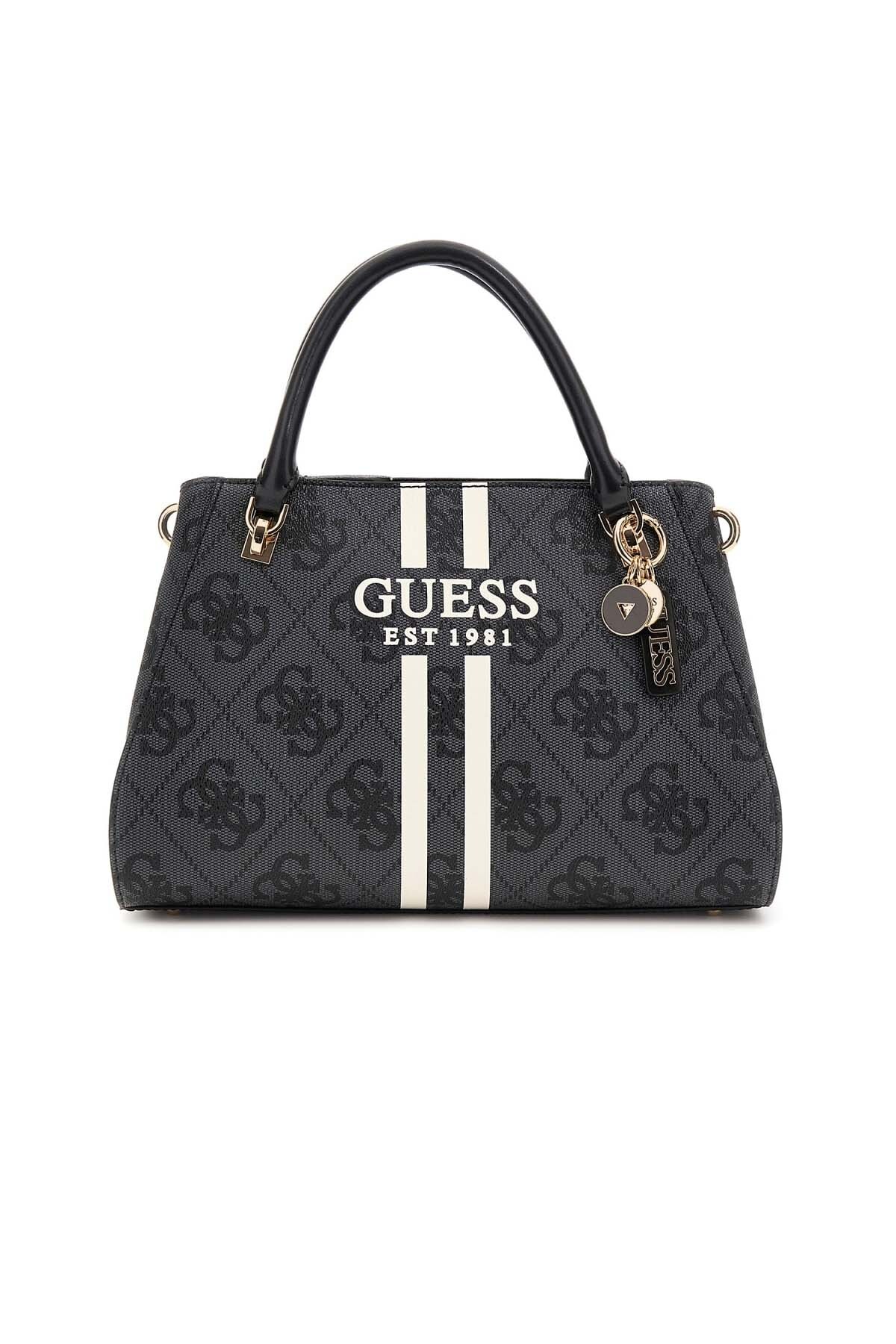 Dinamik ve modern bir tasarıma sahip bu yapılandırılmış el çantası, şehirli bir stil sunar. Tonal monogram desenli antrasit gövdesi, ön yüzeydeki kontrast renkli dikey şeritler ve kuruluş yılını belirten yazı baskısı ile hareketli bir görünüm kazanır. Çift taşıma sapı konforlu bir kullanım sunarken, askıdan sarkan charm seti tasarıma eğlenceli bir dokunuş katar. Arka yüzeydeki fermuarlı cep, pratik bir detay olarak öne çıkar.