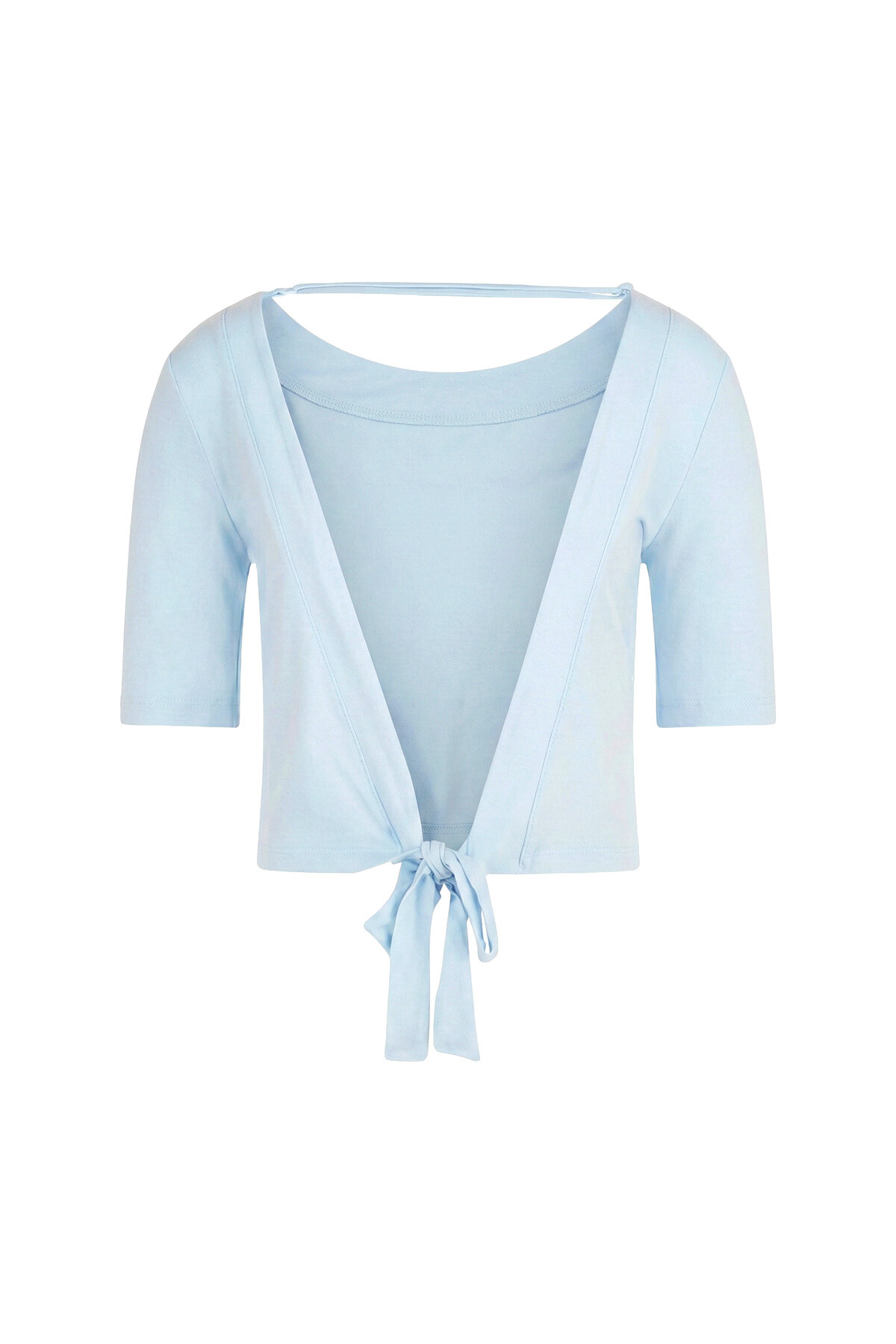 Yaz stilinize romantik ve modern bir dokunuş katan bu açık mavi crop t-shirt, ön yüzündeki sadeliği sırt kısmındaki iddialı detaylarla dengeliyor. %95 viskon ve %5 elastan karışımlı kumaşı, teninizde ipeksi ve yumuşak bir his bırakırken, rahat kalıbı gün boyu konfor sunar. Tasarımın arka yüzündeki derin V dekolte ve etek ucundaki şık fiyonk bağlama detayı, ürüne feminen ve çarpıcı bir hava katar. 40 cm'lik crop boyu ile yüksek belli jeanler ve eteklerle mükemmel bir uyum yakalayan bu parça, minimal şıklığı sevenler için idealdir.
