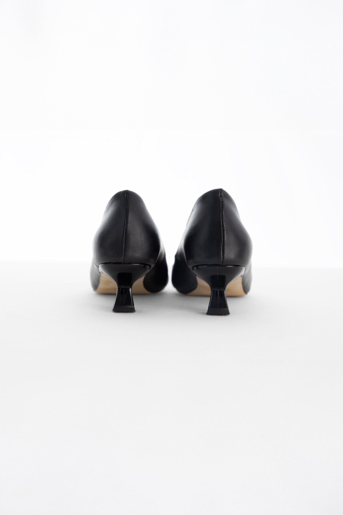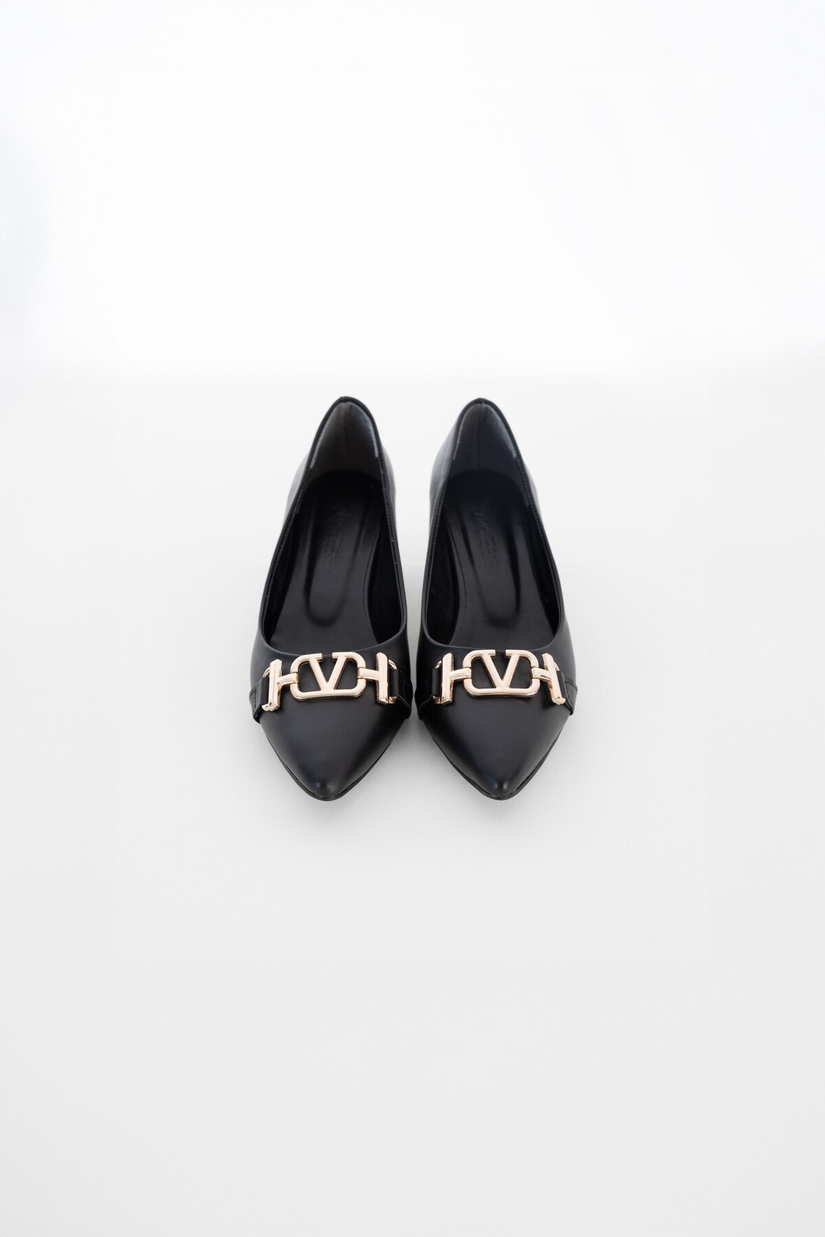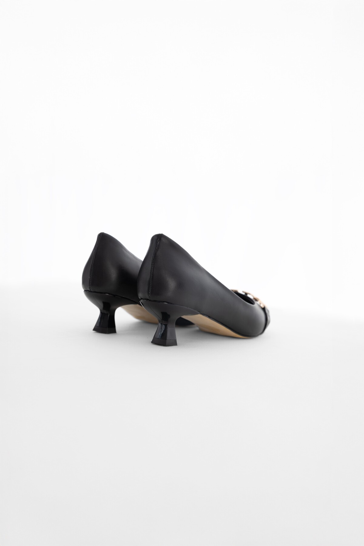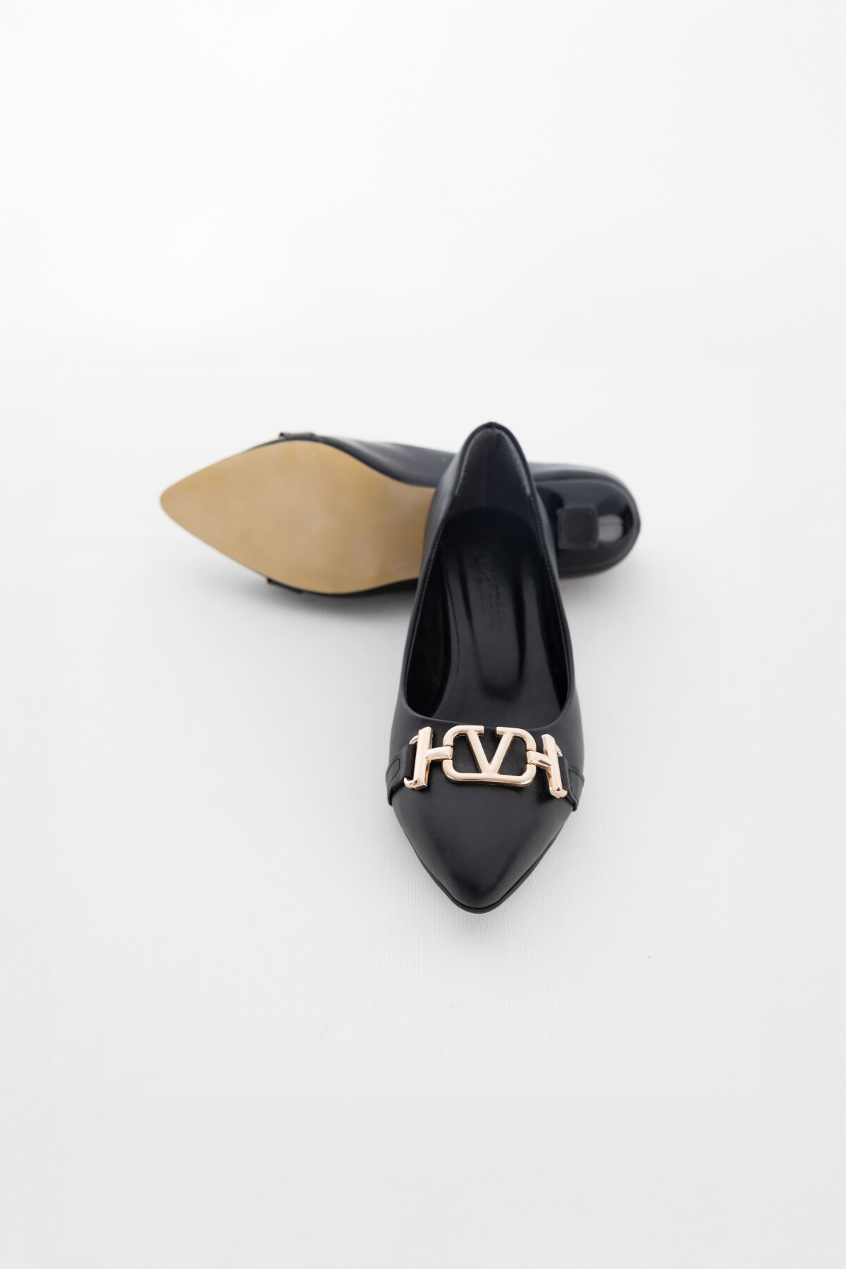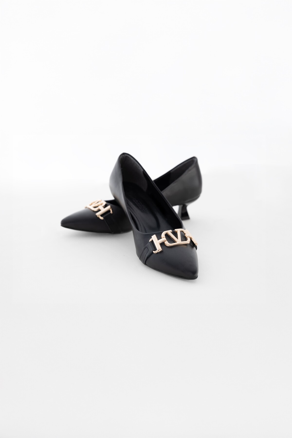 Klasik şıklığı göz alıcı bir detayla birleştiren bu topuklu ayakkabı, her adımda zarafetinizi yansıtacak. Sivri burun kesimi, modern ve feminen bir görünüm sunarken, mimari tasarımlı kısa topuğu gün boyu konforlu ve dengeli adımlar atmanızı sağlar. Dokusuz dış yüzeyi, ayakkabıya sofistike bir hava katar. Ön kısmında yer alan, parlak taşlarla süslenmiş 'V' şeklindeki gold renkli aksesuar, tasarıma lüks ve ışıltılı bir dokunuş yapar. Ofis stilinden özel davetlere kadar geniş bir kullanım alanına sahip olan bu model, hem elbiselerle hem de pantolonlarla mükemmel bir uyum sergiler.