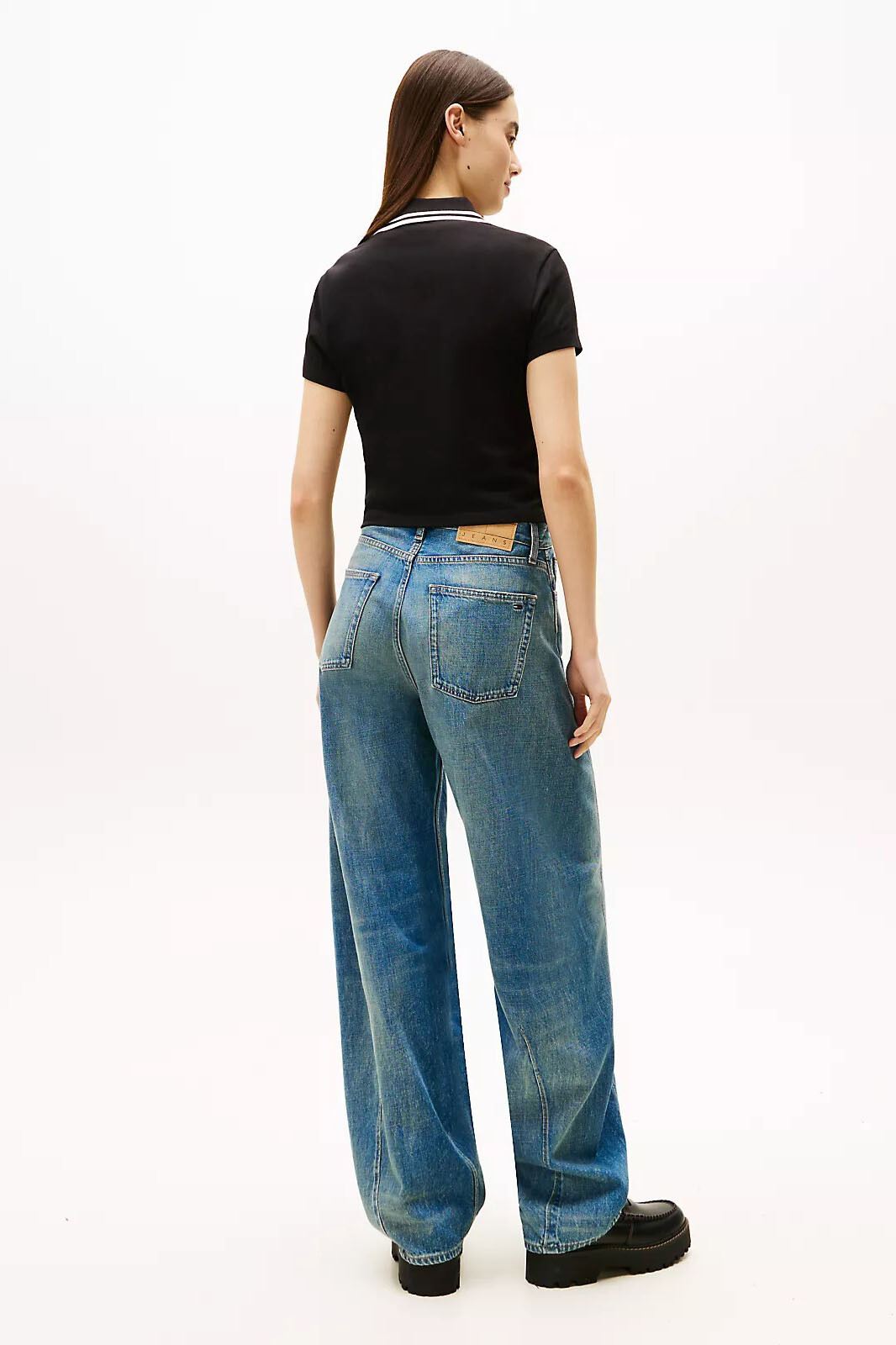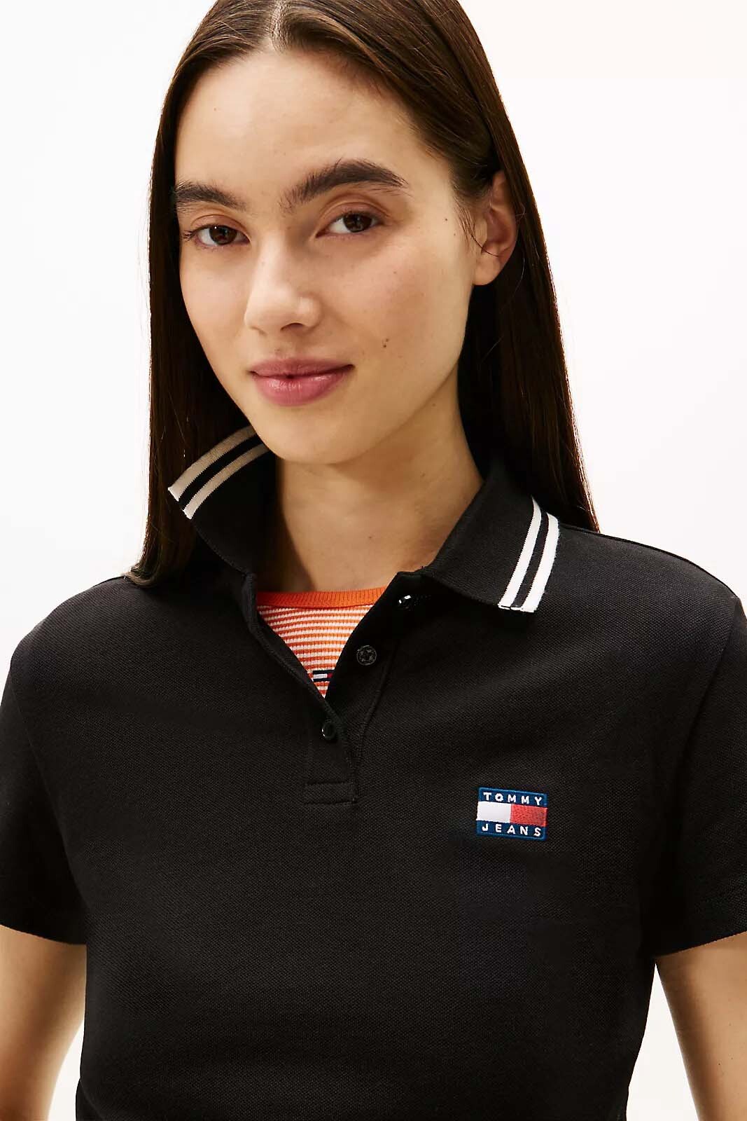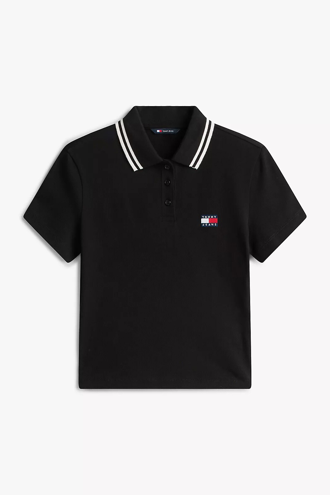 Yaka kısmındaki çift şerit detayı ve bele oturan modern kısa kesimiyle klasik spor giyimi şehir şıklığına taşıyan bu polo tişört, dinamik ve özenli bir görünüm vadeder. %98 pamuk ve %2 elastan karışımlı dokusu, cildinize nefes aldırırken vücut hatlarını nazikçe saran yapısıyla gün boyu konfor sağlar. Siyah zemin üzerindeki beyaz yaka çizgileri ve göğüsteki minimal arma, tasarıma retro bir kolej havası katar. Bel hizasında biten kompakt boyu, özellikle yüksek belli jean ve eteklerle kusursuz bir uyum yakalayarak bacak boyunu vurgular.
