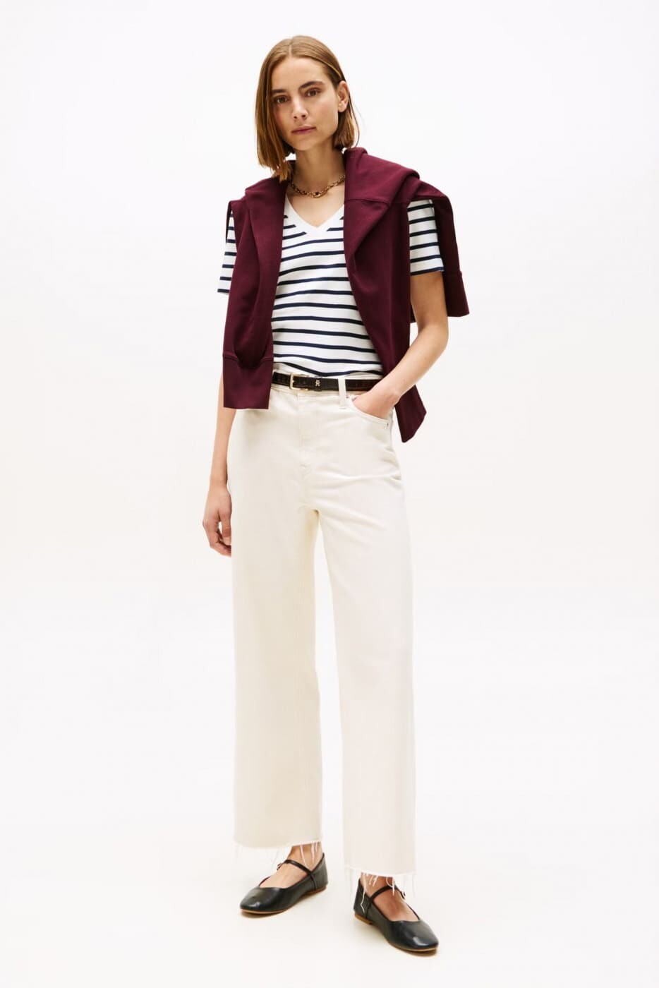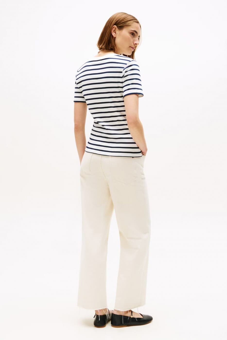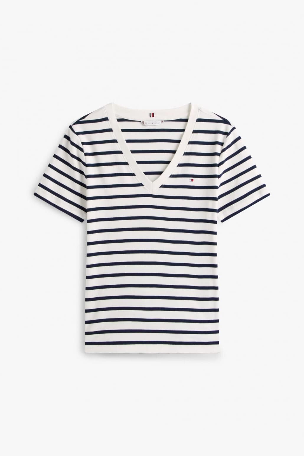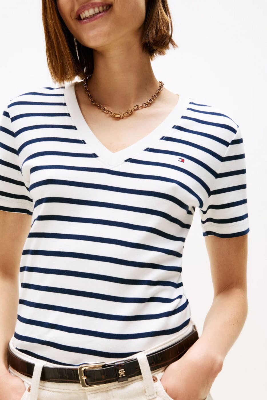 Denizci stilini yansıtan Breton çizgileriyle zamansız bir şıklık sunan bu tişört, %100 saf pamuklu kumaşıyla cildinize doğal bir nefes aldırır. Kumaşın özel ipeksi bitişi, teninizde yumuşak ve premium bir his bırakırken, ince fitilli dokusu tasarıma derinlik katar. Vücuda oturan slim fit kesimi silüetinizi zarifçe belirginleştirir ve feminen bir duruş sergiler. Klasik V yaka tasarımı boynunuzu daha uzun gösterirken, göğüs kısmındaki minimal bayrak logo nakışı markanın ikonik mirasını stilinize yansıtır.