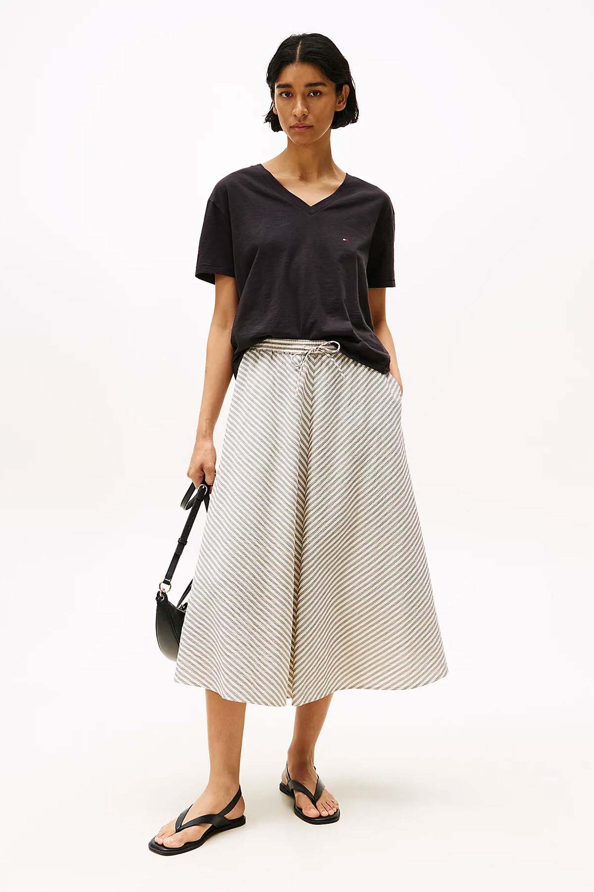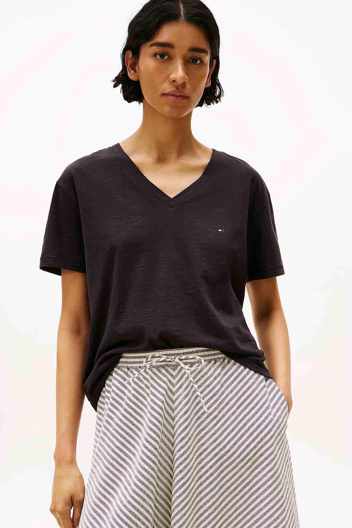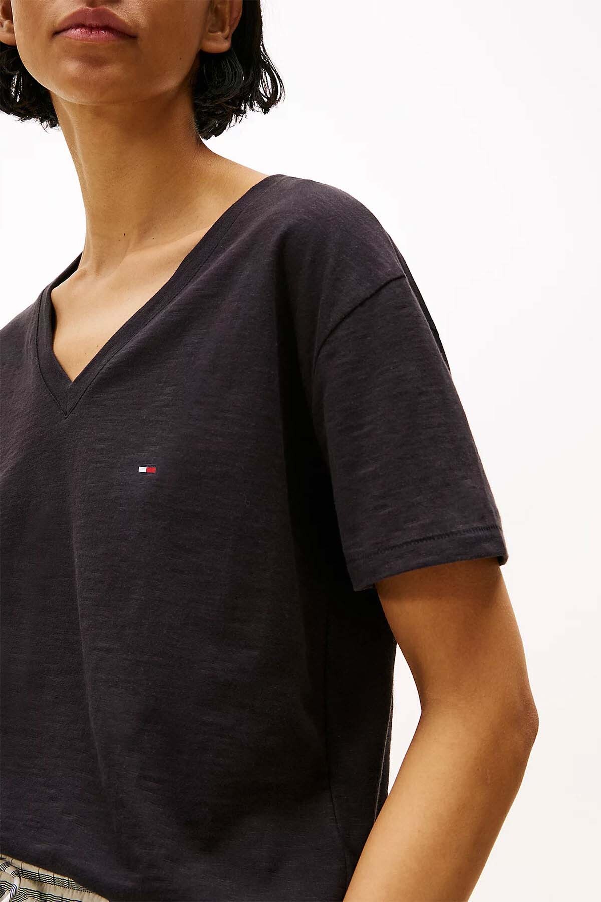 Siyah renkli bu crop tişört, gardırobunuzun temel parçası olmaya aday. %100 pamuklu slub kumaşı, ferah bir hava sunarken, V-yaka detayı ve kısa kolları modern bir siluet yaratır. Bel hizasında biten boyu sayesinde yüksek bel pantolon veya eteklerle mükemmel uyum sağlar. Günlük hayatta sneaker veya sandaletle konforlu ve şık kombinler oluşturabilirsiniz.