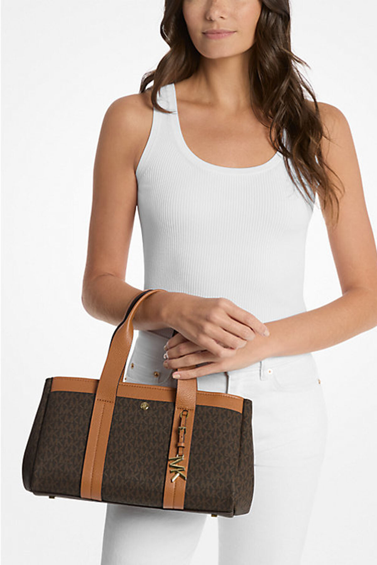 Michael Kors'un Sm Ew Satchel modeli, markanın ikonik kahverengi monogram desenini taba rengi deri detaylarla birleştirerek zamansız bir şıklık sunar. Hem çift el sapı hem de ayarlanabilir uzun omuz askısı ile çok yönlü bir kullanım sağlayan bu çanta, geniş iç hacmiyle günlük ihtiyaçlarınız için idealdir. Ön kısımdaki parlak altın rengi MK logo charm detayı, tasarıma lüks ve tanınır bir imza katıyor.