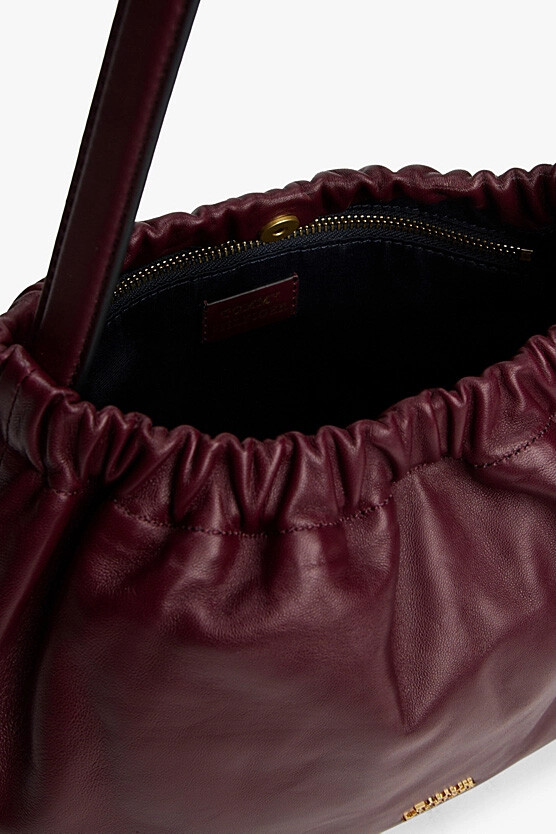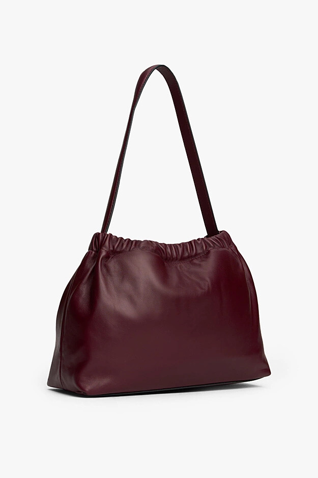 "Marzemino" şarap kırmızısının derin ve tutkulu tonu, %100 Napa derinin ipeksi yumuşaklığıyla bu çantada hayat buluyor. Soft Leather Shoulder Bag, klasik omuz çantası anlayışını ağız kısmındaki sanatsal büzgü detaylarıyla modern ve heykelsi bir forma dönüştürüyor. Pürüzsüz bitişli gerçek deri yüzeyi lüks bir dokunuş hissi verirken, çuval formundaki rahat silüeti stilinize zahmetsiz bir şıklık katar. 34 cm'lik genişliği ve 5 litrelik iç hacmiyle günlük ihtiyaçlarınız için ideal bir alan sunan bu tasarım; pratik çıtçıtlı kapama sistemi, omuzda konforla taşınan tek askısı ve ön yüzdeki zarif metal logosuyla kombinlerinizin yıldız parçası olmaya aday.