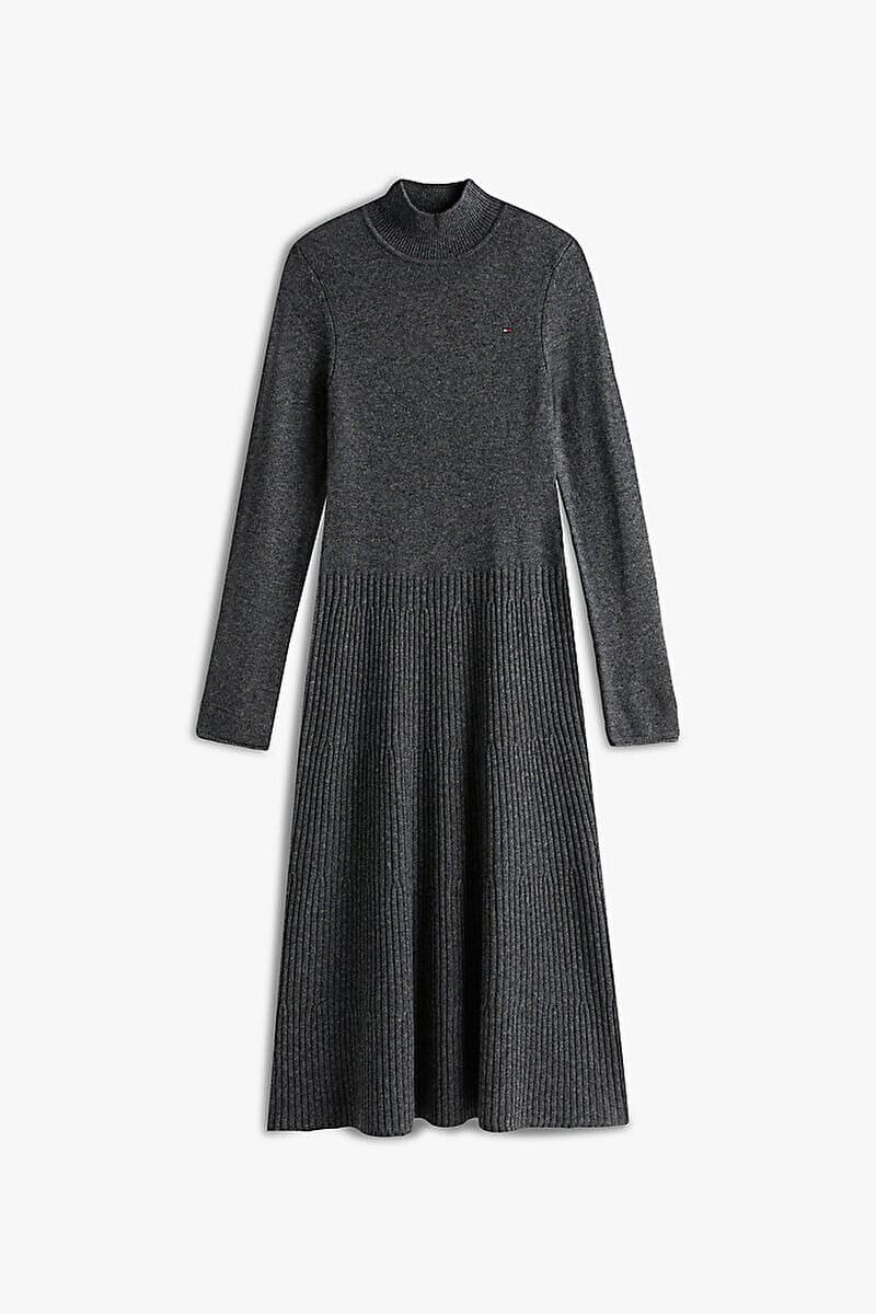 Saf yün dokusunun sunduğu doğal sıcaklığı ve yumuşaklığı zarif bir tasarımla buluşturan bu antrasit triko elbise, kış gardırobunuzun en özel parçalarından biri olmaya adaydır. Yarım balıkçı yaka kesimi ve vücudu nazikçe saran üst yapısı, belden aşağıya doğru hafifçe genişleyen ribana örgü etekle birleşerek feminen ve modern bir siluet yaratır. Esnek yapısı sayesinde hareket özgürlüğü sunarken, midi boyu ile hem çizmelerle hem de topuklu ayakkabılarla zahmetsizce şık kombinler oluşturmanıza olanak tanır. Göğüs kısmındaki minimalist nakış detayı, sadeliğe zarif bir imza atar.
