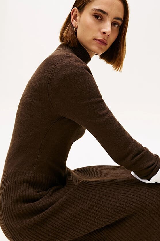 Saf yünün doğal sıcaklığını ve ipeksi yumuşaklığını sunan bu kahverengi triko elbise, kış aylarında zarafeti ve konforu bir arada arayanlar için tasarlandı. Yarım balıkçı yaka detayı boynu nazikçe sararken, belden aşağıya doğru hafifçe genişleyen ribana örgü etek kısmı modern ve akıcı bir siluet oluşturur. Vücut hatlarını sıkmadan saran esnek yapısı gün boyu rahatlık sağlar. Midi boyu sayesinde ister uzun çizmelerle ister kısa botlarla kombinleyerek hem ofis şıklığına hem de hafta sonu davetlerine kolayca uyum sağlayan zamansız bir parçadır.