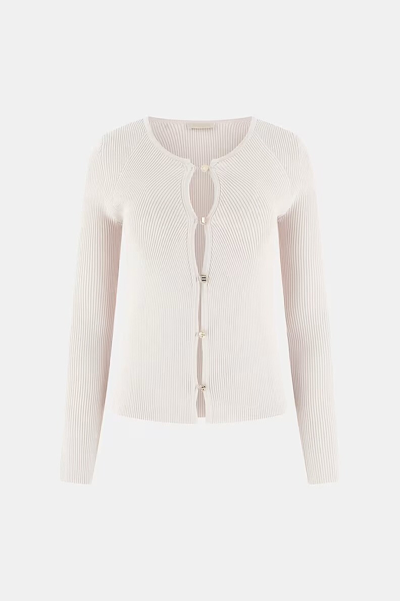 Kırık beyazın saf ve zamansız asaletini, vücudu nazikçe saran fitilli örgü dokusuyla buluşturan Stella hırka, her mevsimin kurtarıcı parçası olmaya aday. Viskoz, polyamid ve elastan karışımından oluşan yumuşak dokusu, esnek yapısıyla silüetinize mükemmel uyum sağlarken gün boyu konfor sunuyor. Tasarımın merkezinde yer alan zarif cut-out pencere detayları ve bu açıklıkları birbirine bağlayan şık metalik tokalar, kırık beyazın sadeliğine modern ve sofistike bir hareketlilik katıyor. Yuvarlak yaka kesimi ve uzun kollu formuyla, hem tek başına hem de ceket içlerinde kullanılarak stilinize aydınlık bir dokunuş yapıyor.