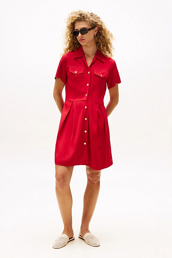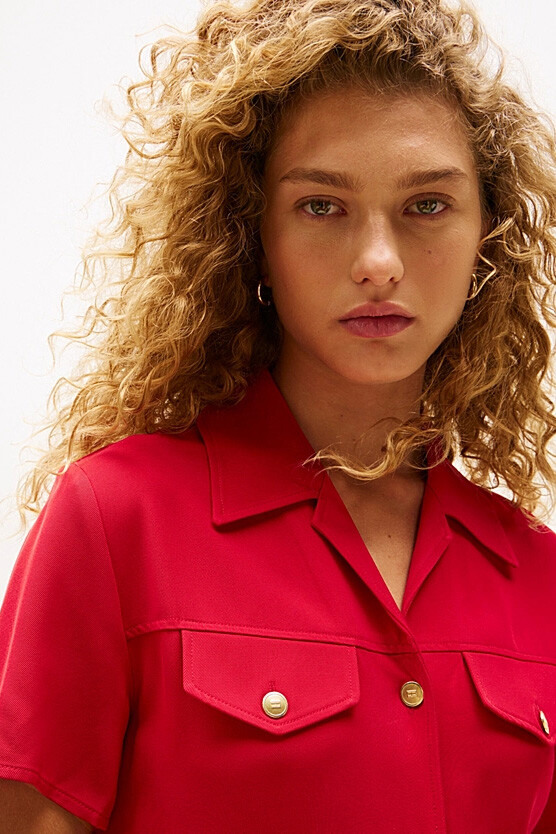 Kadın Tam Kalıp Gömlek Yaka Pli Detaylı Mini Elbise - Kırmızı