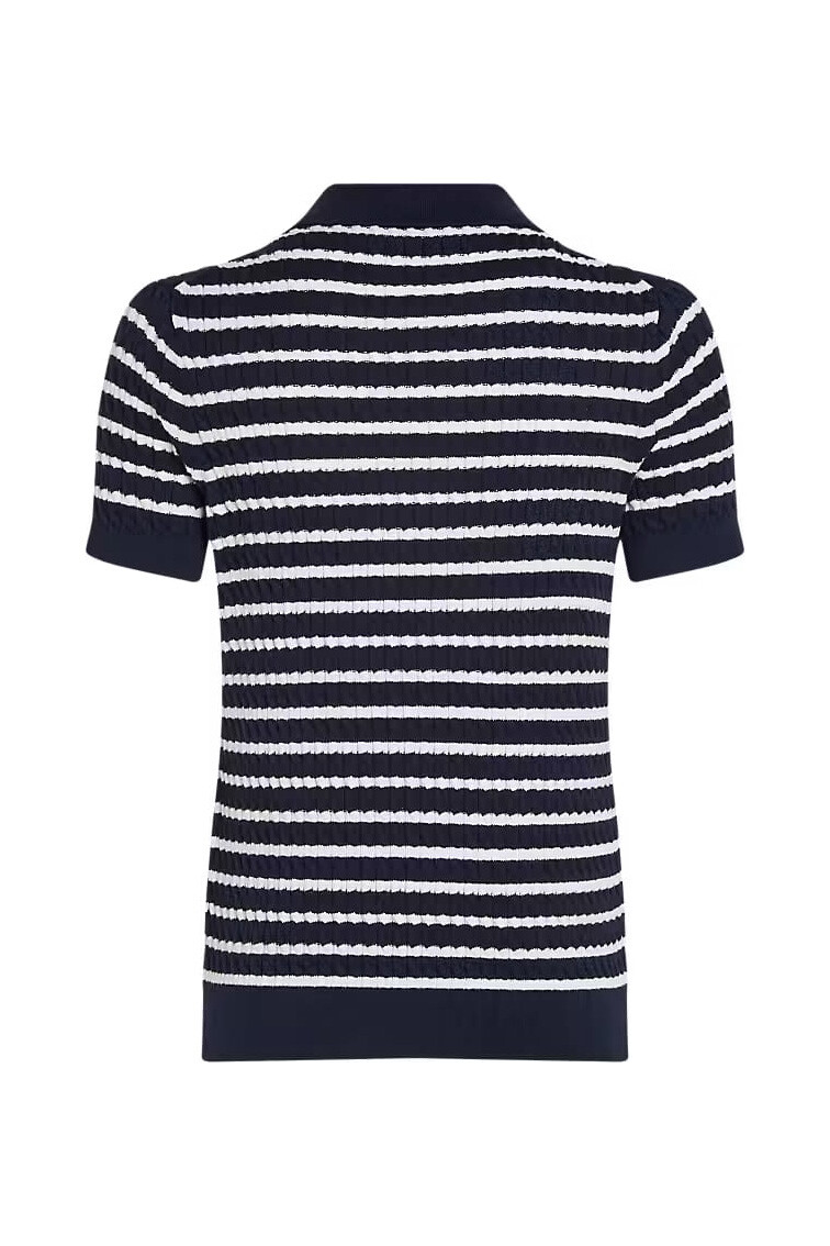 Klasik polo yaka stilini, feminen triko dokusuyla birleştiren bu parça, gardırobunuza zamansız bir zarafet katıyor. %100 pamuklu, ince saç örgüsü dokusu, hem cildinize nefes aldıran bir konfor sunar hem de tasarıma zengin bir görünüm katar. Lacivert ve beyazın uyumlu çizgileri enerjik ve marin bir hava yaratırken, esnek yapısı vücudunuza mükemmel uyum sağlar. Chino pantolonlardan eteklere kadar birçok farklı parçayla kombinleyebilirsiniz.