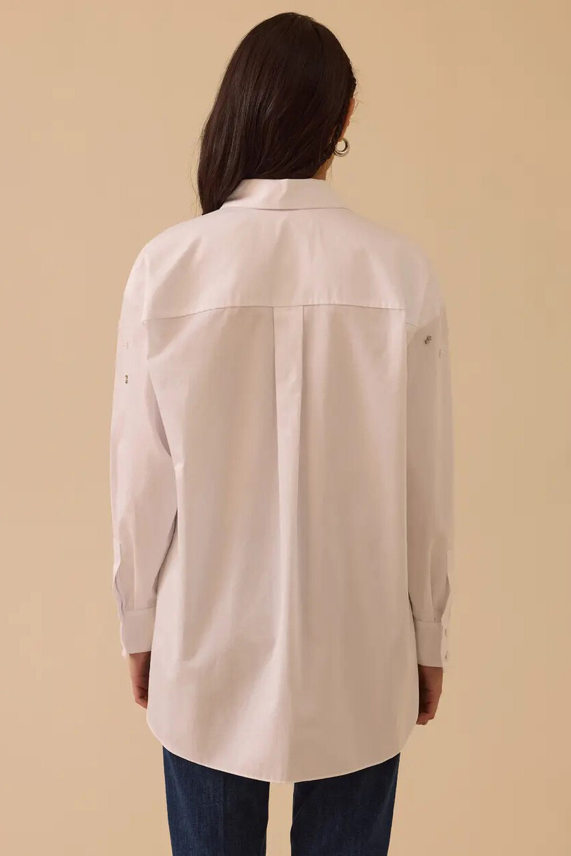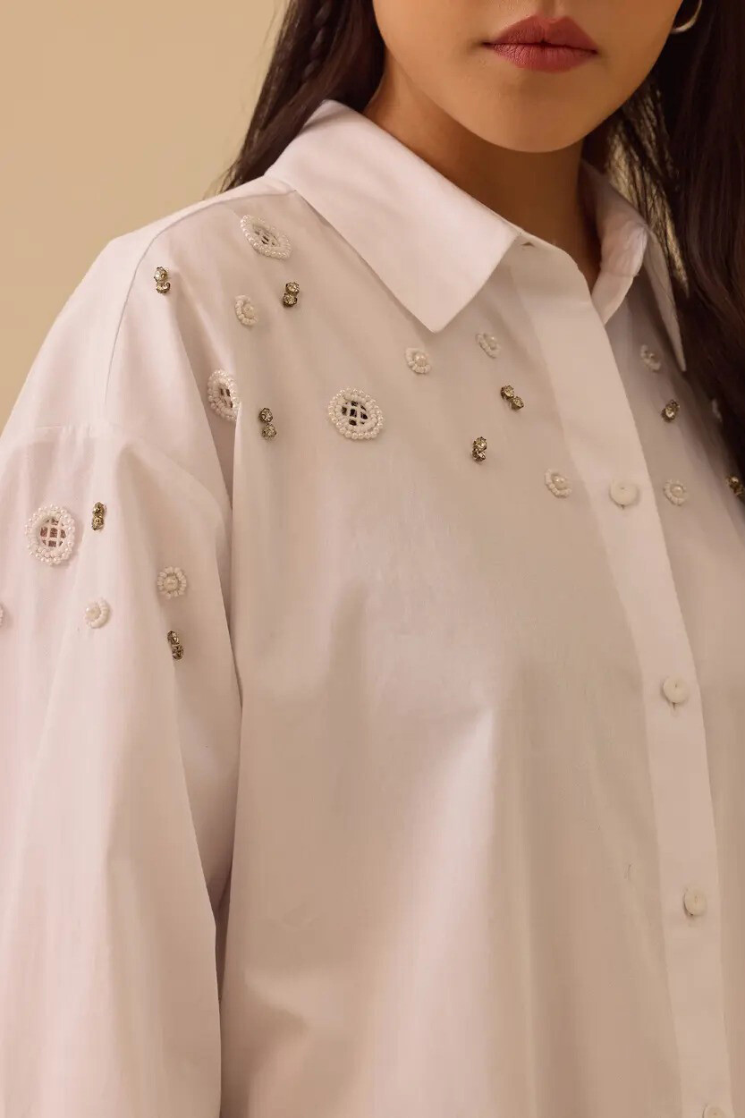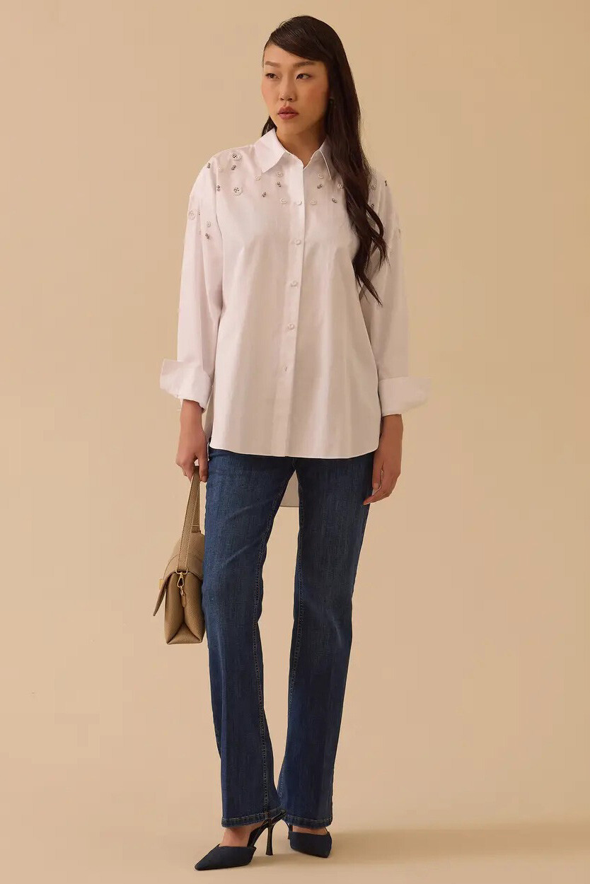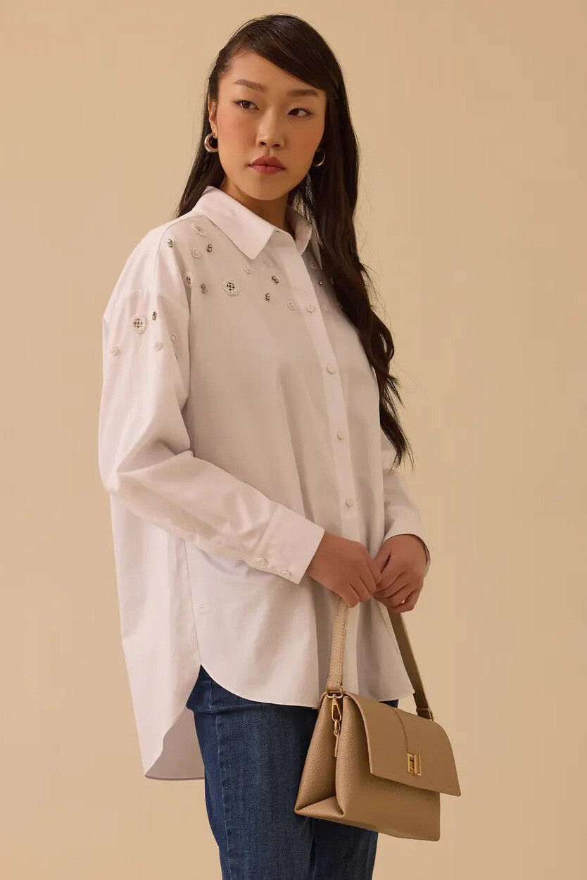Beyazın ferah ve tazeleyici ruhunu ışıltılı detaylarla buluşturan bu tasarım, gardırobunuza modern bir dinamizm katmak için özenle hazırlandı. Omuzlardan göğüs hizasına doğru zarifçe serpiştirilen taş işlemeleri, klasik gömlek yakasıyla göz alıcı bir tezat yaratarak tasarıma sanatsal bir hareket kazandırır. %100 pamuklu nefes alabilen dokusu ve düşük omuzlu dökümlü kesimi gün boyu bedeninize uyum sağlayarak üstün konfor sunar. Sırtta yer alan usta işi roba detayı ve aşağı doğru süzülen kavisli etek ucuyla, hem jean pantolonlarla hafta sonu stilinizde hem de kumaş pantolonlarla ofis şıklığında başrolü üstlenecek kurtarıcı bir parçadır.