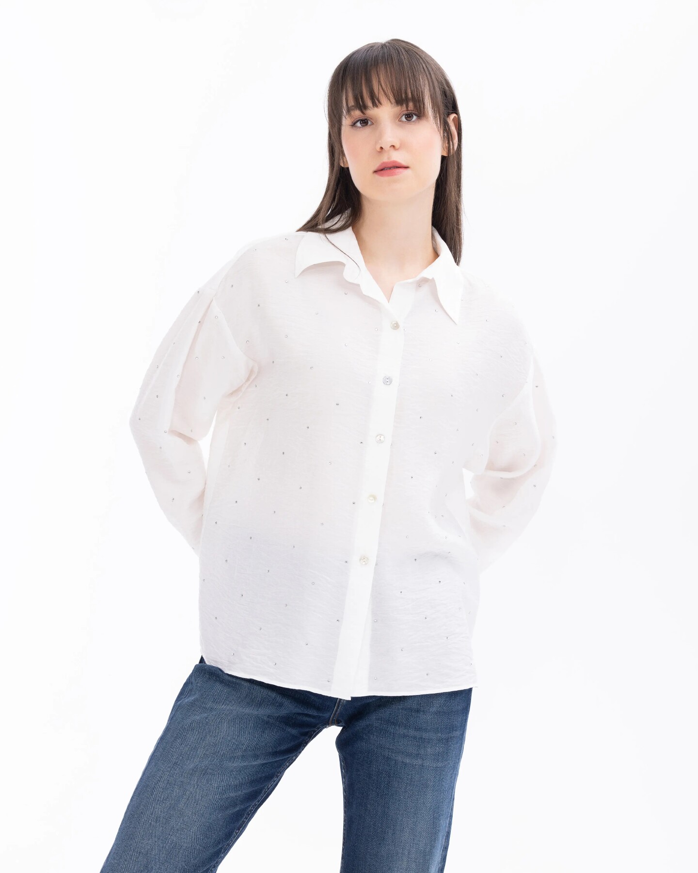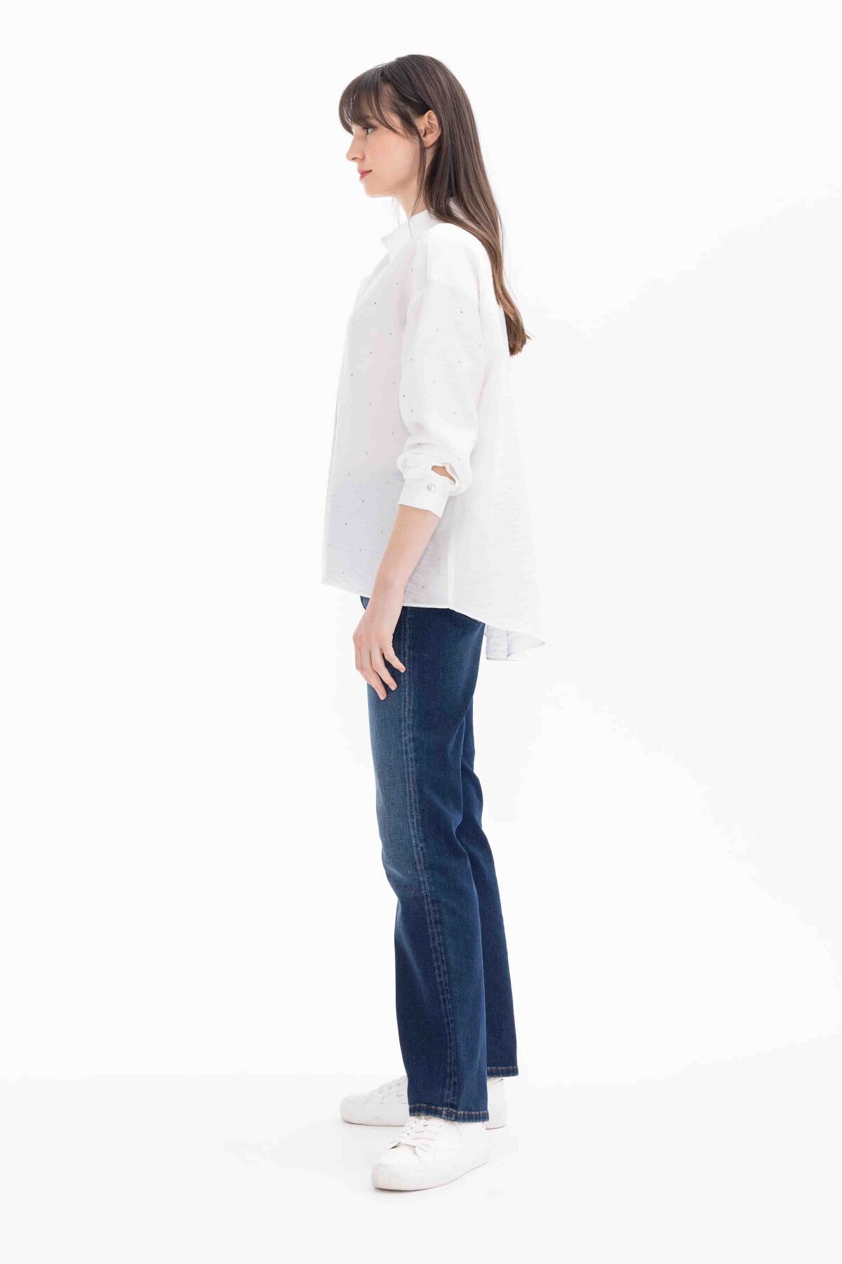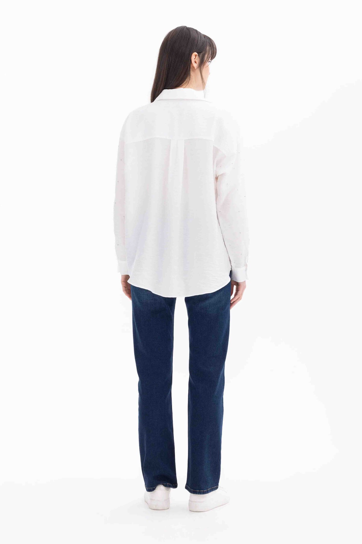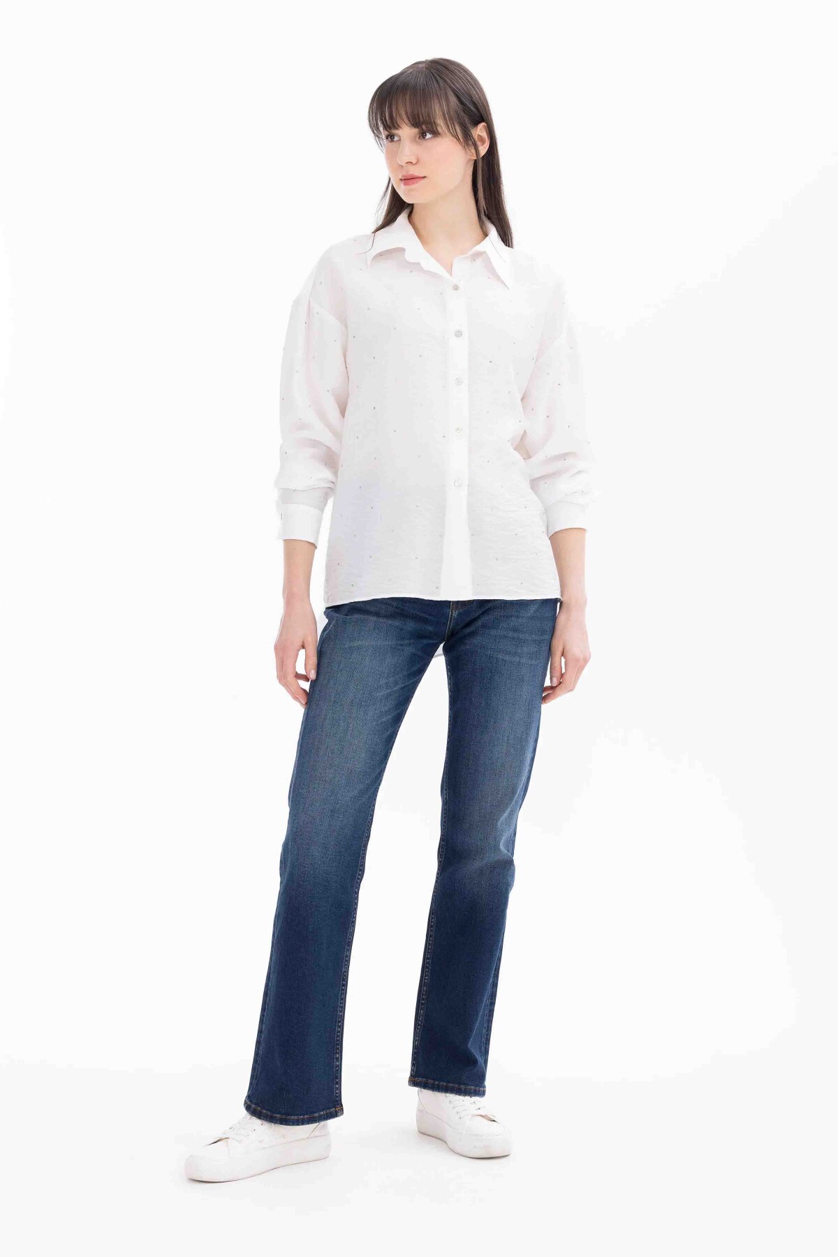 Kadın Taşlı Düşük Kol Gömlek-Beyaz