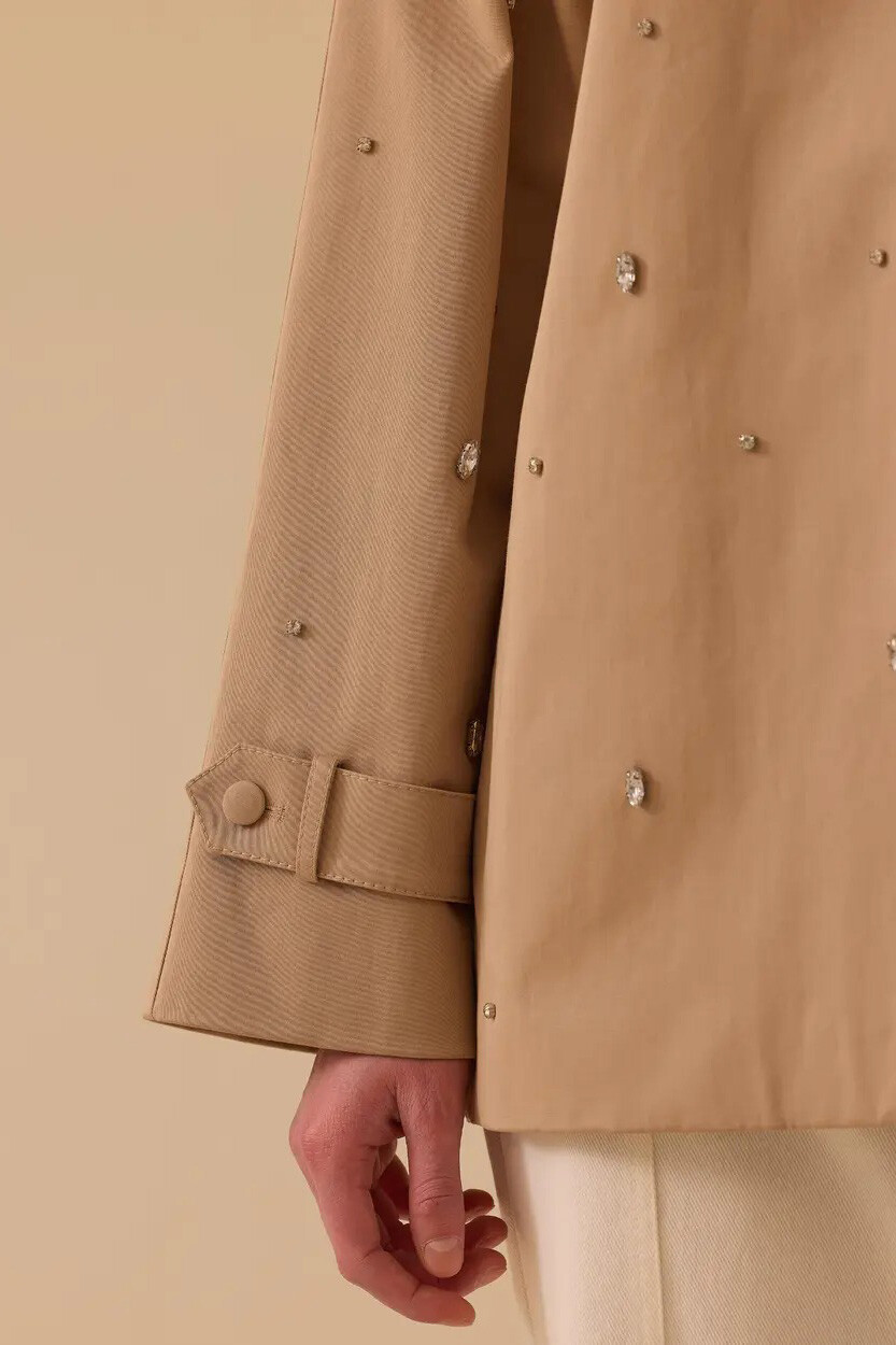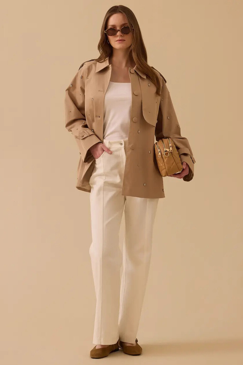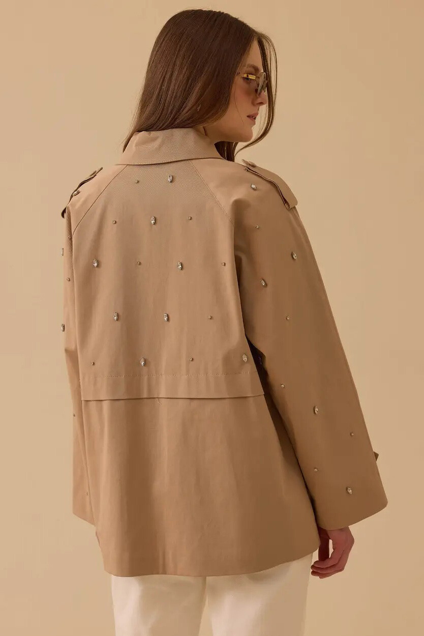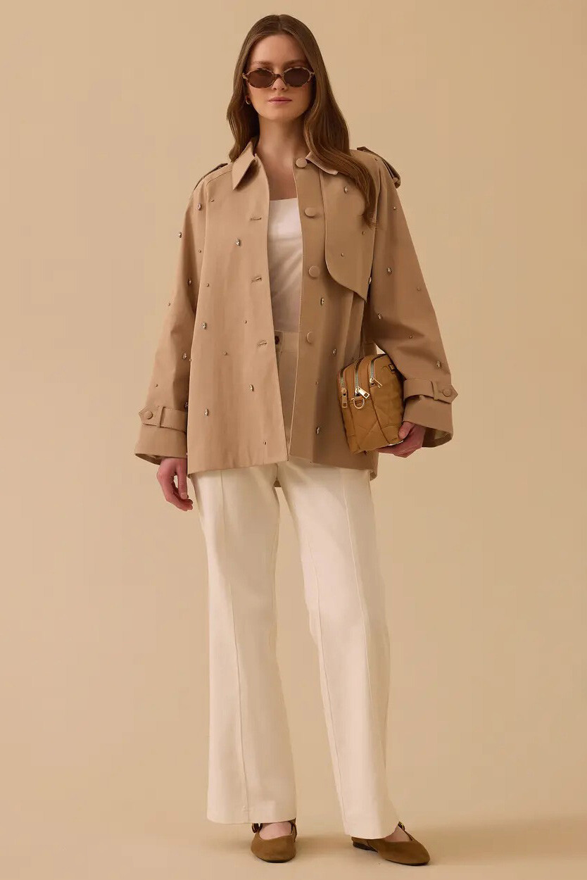 Gardırobunuzun vazgeçilmez klasiği olan trençkotu, ışıltılı detaylar ve modern bir kalıpla yeniden yorumlayan bu tasarım, dış giyiminize iddialı bir dokunuş yapmak için özenle hazırlandı. Tüm yüzeyine zarifçe serpiştirilmiş kristal taş işlemeleri, her adımınızda göz alıcı bir parlaklık sunarak tasarımı sıradanlıktan uzaklaştırır. Yüksek oranda pamuk içeren nefes alabilen dokusu ve dökümlü geniş kesimi gün boyu üstün bir hareket özgürlüğü sağlarken; omuz apoletleri ve rüzgarlık (roba) detayları usta terzi işçiliğini vurgular. İçi tamamen astarlı yapısı ve bel hizasında biten kullanışlı boyuyla, hem jean hem de kumaş pantolon kombinlerinizin en pratik ve zarif yıldızı olacak.