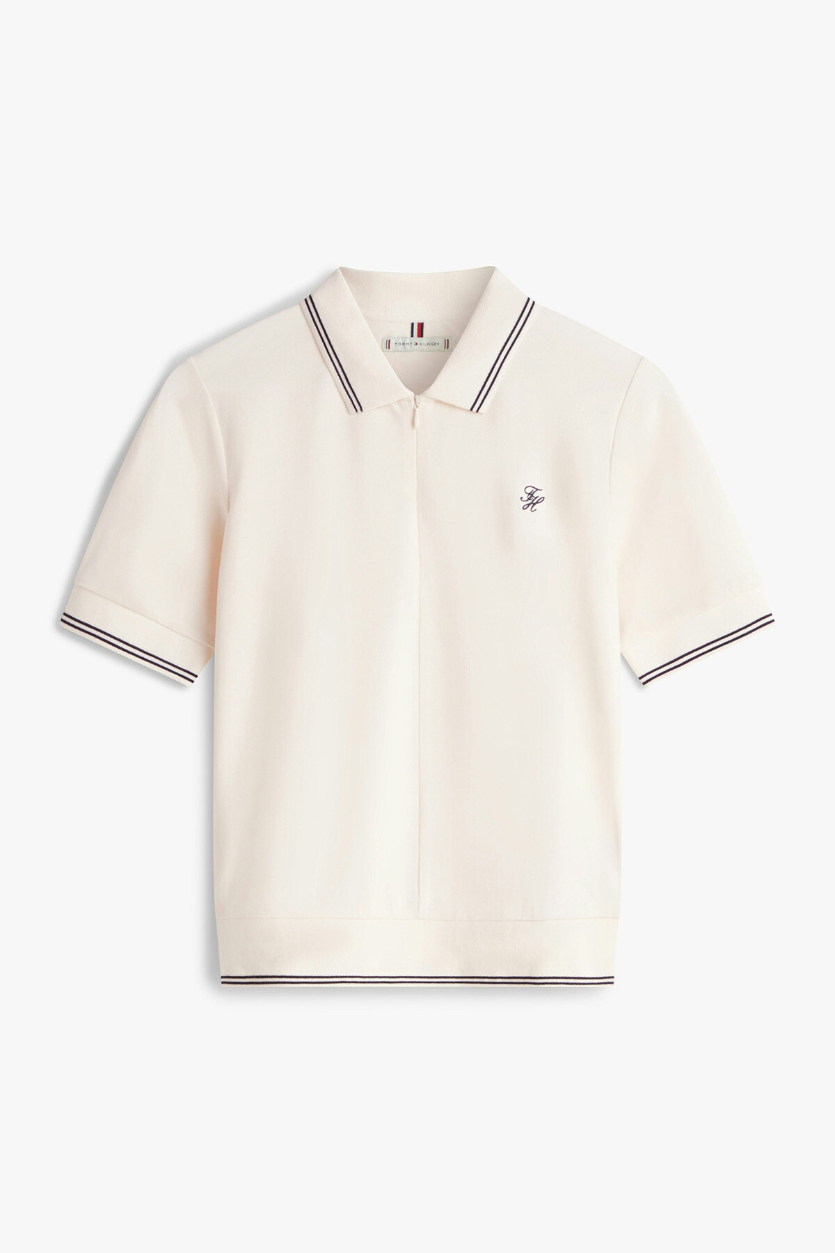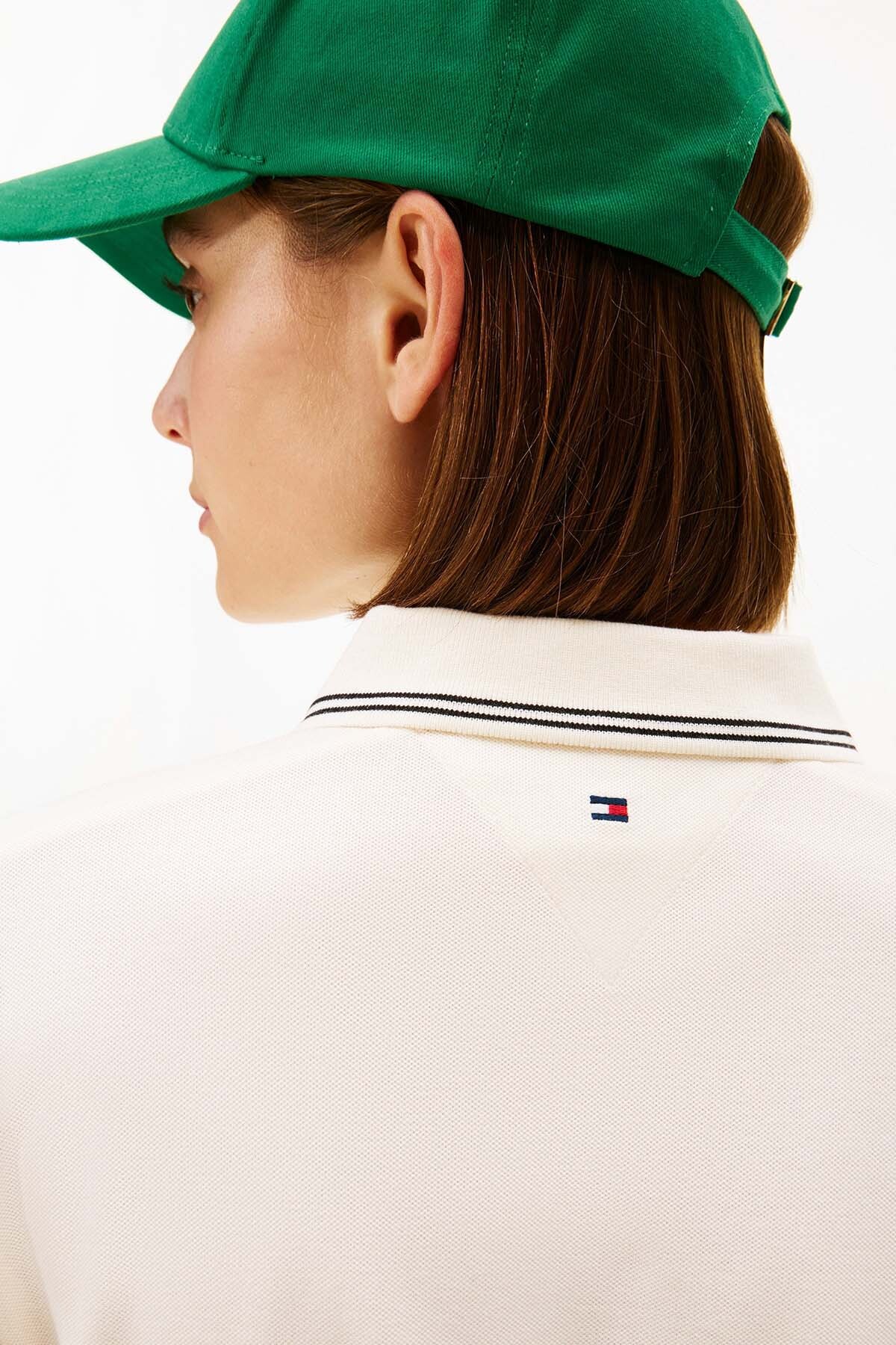 Tenis kortlarının klasik zarafetini modern şehir stiliyle buluşturan polo t-shirt, yumuşak krem tonuyla gardırobunuza ferah bir dokunuş katıyor. Standart düğmeli pololardan farklı olarak kullanılan fermuarlı yaka detayı, tasarıma çağdaş ve dinamik bir hava kazandırırken kullanım kolaylığı sağlıyor. Yüksek oranda sürdürülebilir Liosel lifleri içeren pike kumaşı, pamuğun nefes alabilirliğini ipeksi bir yumuşaklıkla birleştirerek gün boyu serin ve konforlu hissetmenize yardımcı oluyor. Yaka, kol manşetleri ve etek ucundaki lacivert şeritler, krem zemin üzerinde sportif bir kontrast oluştururken; göğüsteki zarif el yazısı nakış logo stile minimalist bir imza atıyor.