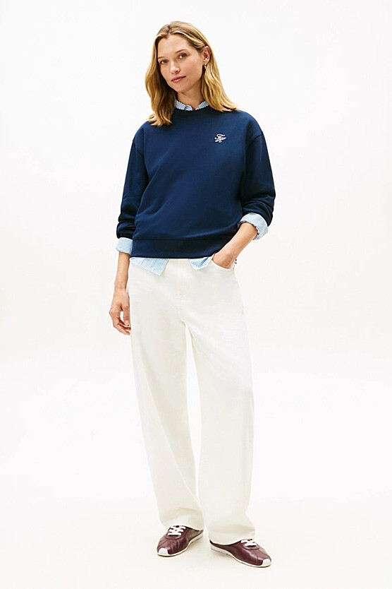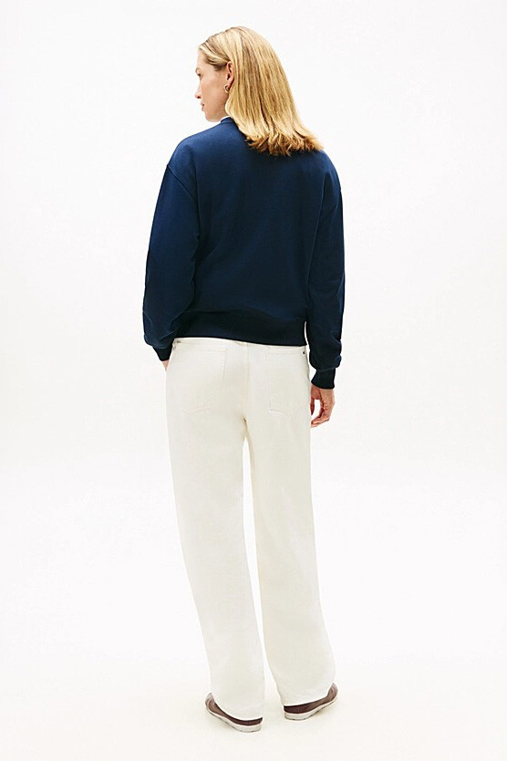 Zamansız stilin en asil temsilcisi olan terry sweatshirt, derin ve sofistike lacivert tonuyla gardırobunuza modern bir klasik kazandırıyor. Göğüs kısmındaki beyaz renkli zarif el yazısı nakış logo, koyu zemin üzerinde incelikli bir kontrast oluşturarak tasarıma premium bir hava katıyor. Pamuk karışımlı esnek terry kumaşı, mevsim geçişlerinde cildinize nefes aldıran ideal bir sıcaklık sunarken; düşük omuzlu rahat kesimi, hareket özgürlüğünü şıklıkla birleştiriyor.