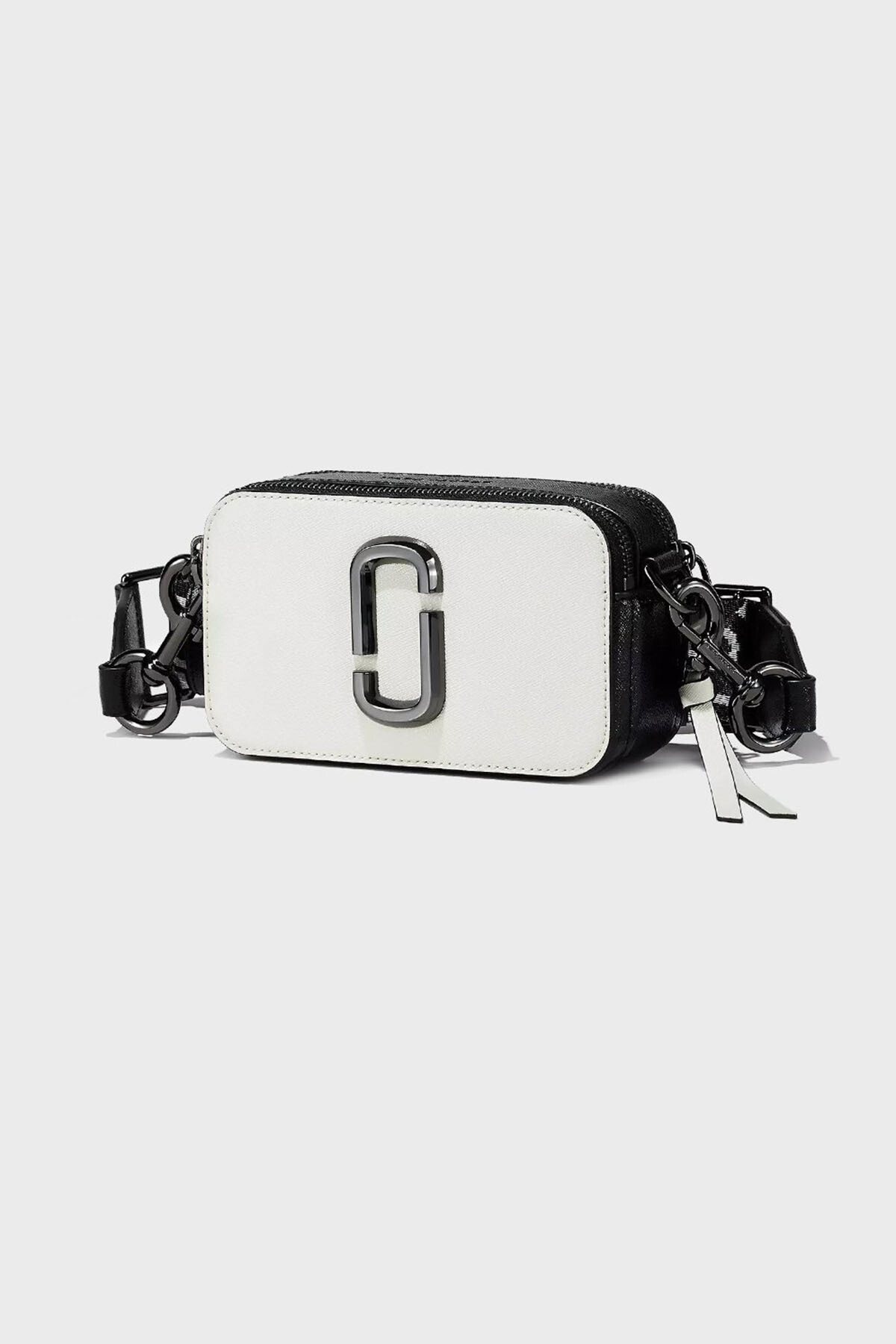Marc Jacobs'ın kült modeli "The Snapshot DTM", modern ve kompakt tasarımıyla stilinize imza atıyor. Siyah ve beyazın kontrast renk bloklu (colorblock) tasarımı, baştan aşağı tek renk (DTM - Dyed-to-Match) metalik 'J' logosu ve donanımlarla tamamlanarak sofistike bir görünüm sunar. Çift fermuarlı iki ana bölmesi, eşyalarınızı düzenli tutmak için ideal bir alan sağlar. Çıkarılabilir ve ayarlanabilir geniş dokuma askısı, markanın logosuyla bezenmiş olup çantayı hem omuzda hem de çapraz olarak kullanma imkanı tanır.