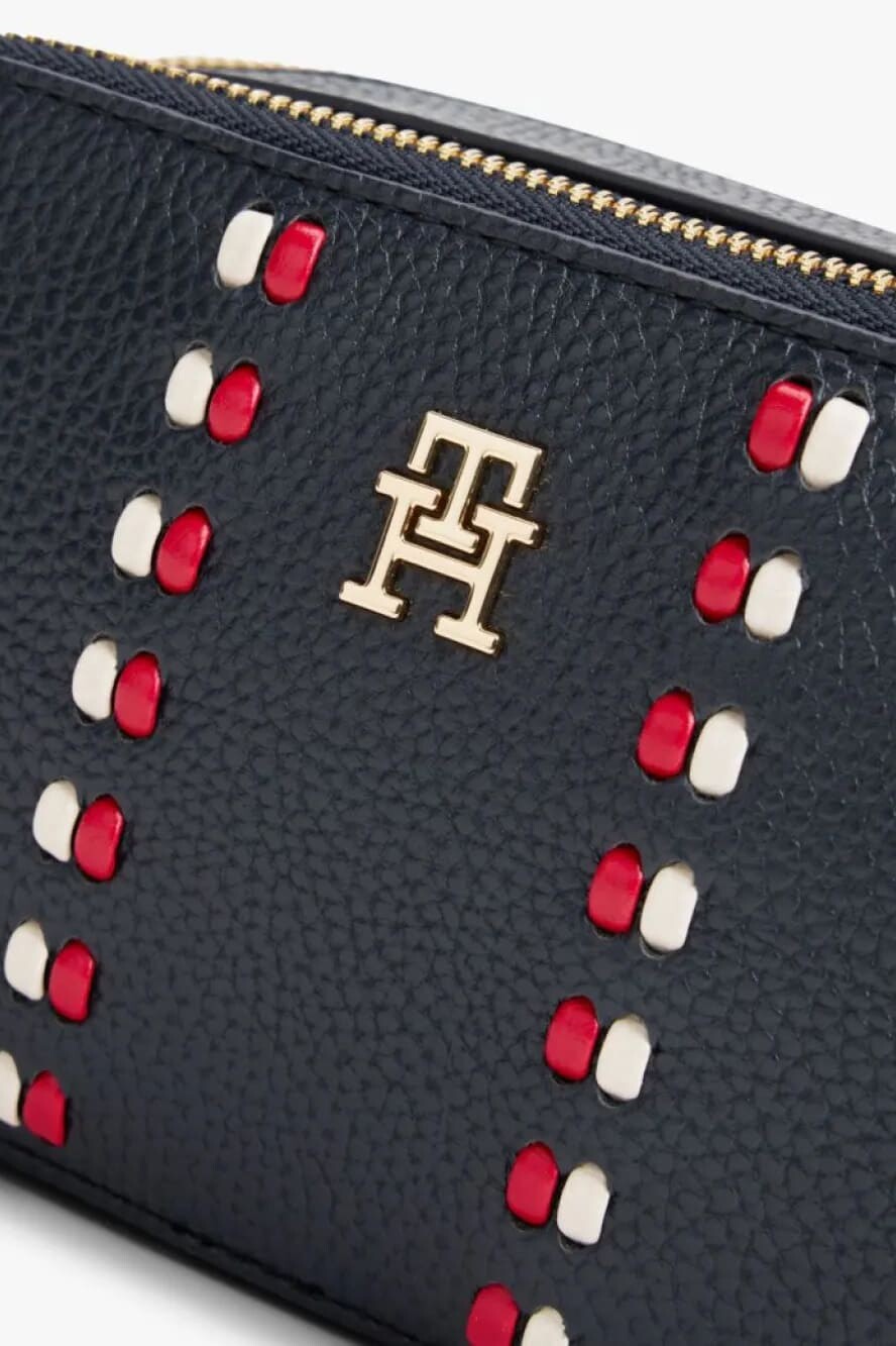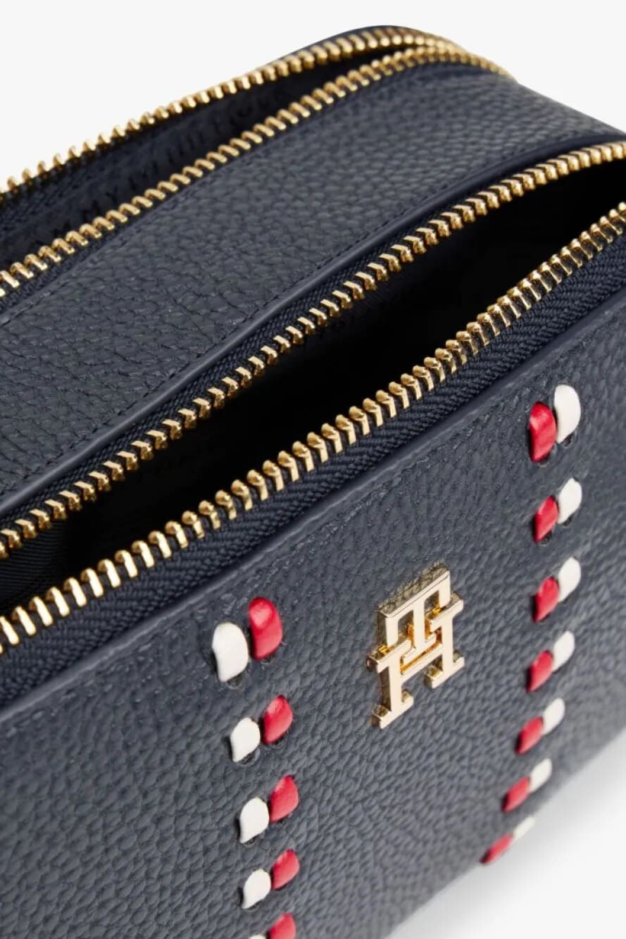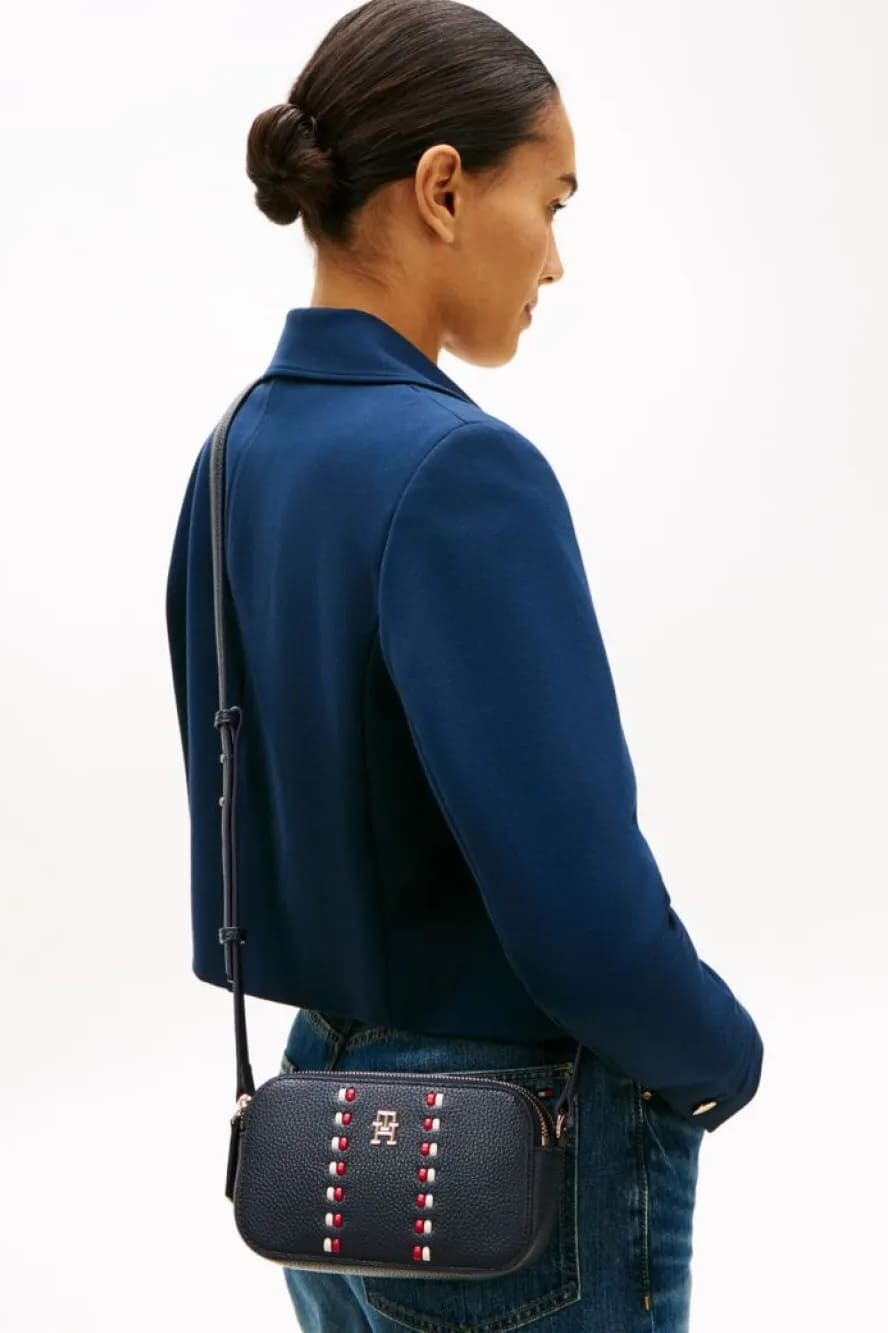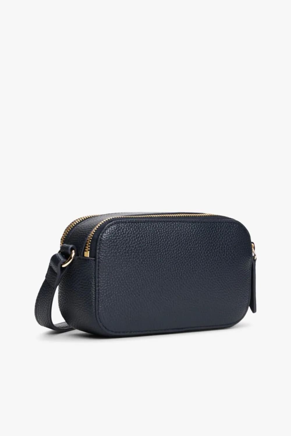Şehirli kadının dinamik stiline uyum sağlayan bu kamera çanta formu, kompakt yapısı ve estetik detaylarıyla dikkat çekiyor. Lacivert rengin asaleti, ön yüzdeki kırmızı ve beyaz dekoratif dikiş şeritleri ve gold renkli metal logo ile hareketlendirilerek modern bir görünüm sunuyor. Pütürlü dokuya sahip dayanıklı yüzeyi ve fermuarlı yapısı, telefon, cüzdan ve anahtar gibi temel eşyalarınızı güvenle taşımanızı sağlar. Ayarlanabilir uzun askısı sayesinde ister omuzda ister çapraz olarak kullanarak ellerinizi serbest bırakabilir, gün boyu konforlu bir şıklık yakalayabilirsiniz.