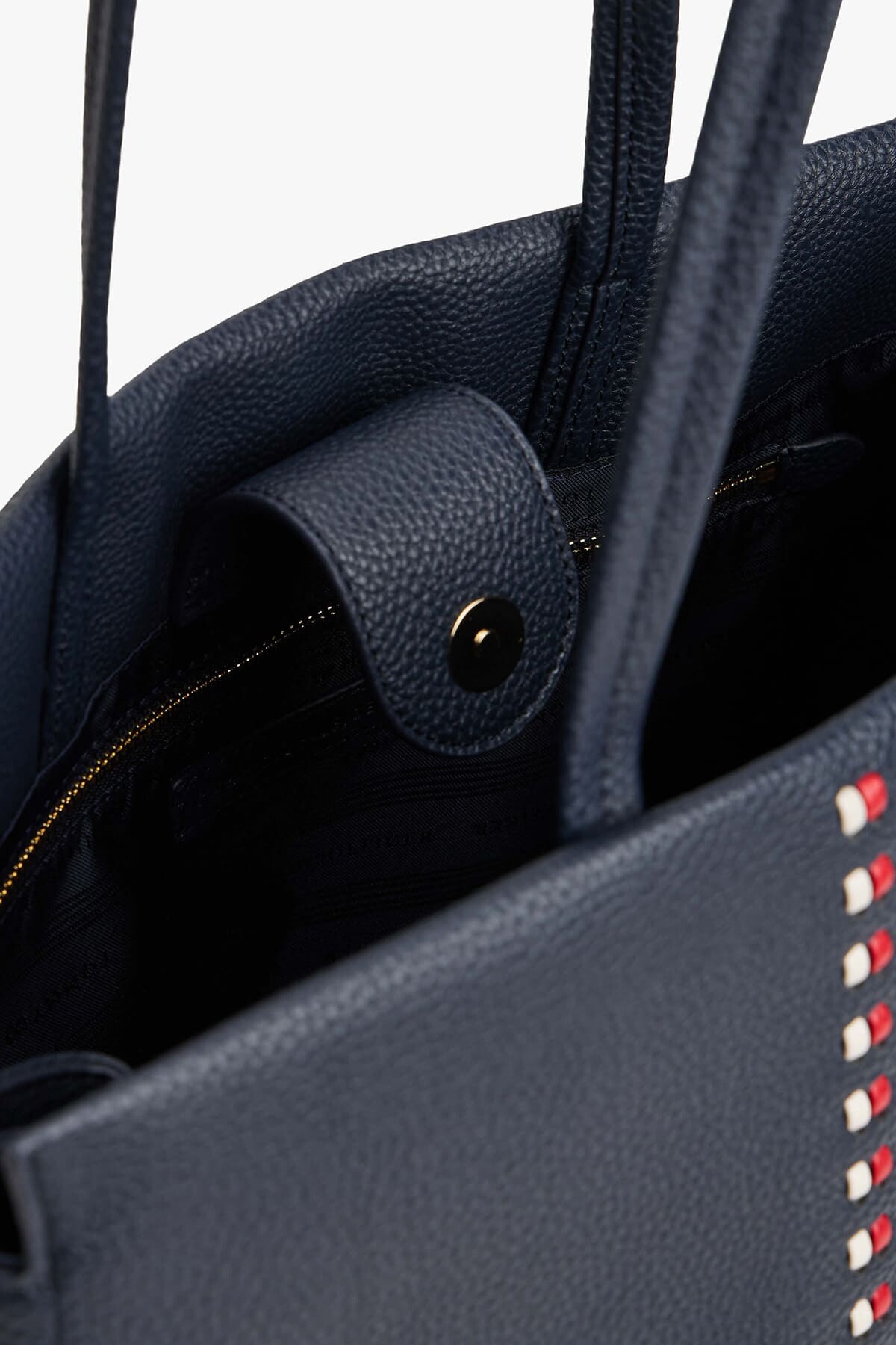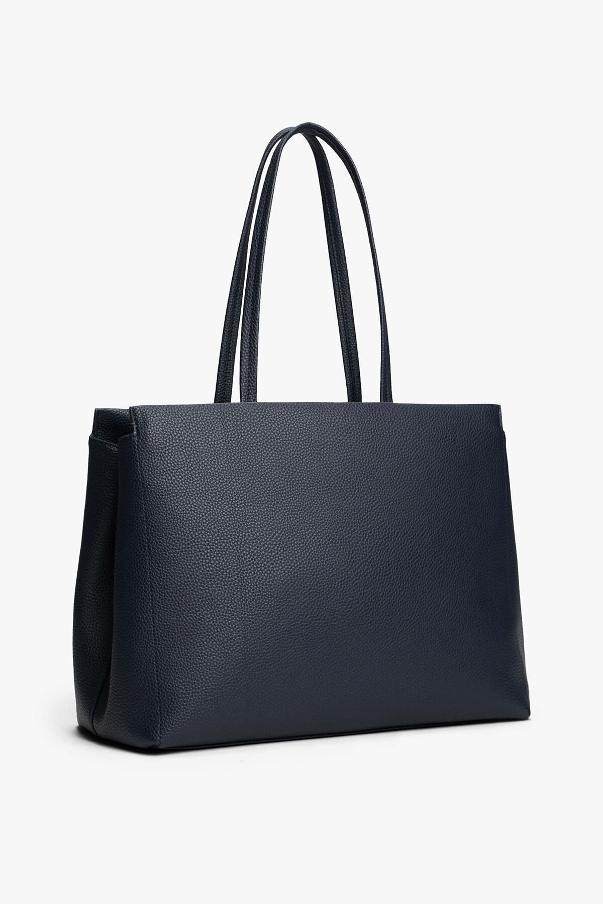 Modern şehir hayatının temposuna ve stiline kusursuz bir uyum sağlayan bu tote çanta, lacivert tonunun derinliğiyle asaleti simgeliyor. Ön yüzeyinde yer alan kırmızı ve beyaz renkli dekoratif dikiş detayları, çantanın klasik duruşuna enerjik ve çağdaş bir hava katarken, gold renkli metal logo şıklığı tamamlayan zarif bir imza niteliği taşıyor. 45 cm'lik genişliği ve hacimli yapısı sayesinde dizüstü bilgisayarınızdan kişisel eşyalarınıza kadar tüm gereksinimlerinizi rahatlıkla taşıyabilirsiniz. Omuzda konforlu bir kullanım sunan ideal askı boyu ve dayanıklı dokusuyla, hem ofis kombinlerinizin hem de hafta sonu gezmelerinizin vazgeçilmezi olmaya aday.