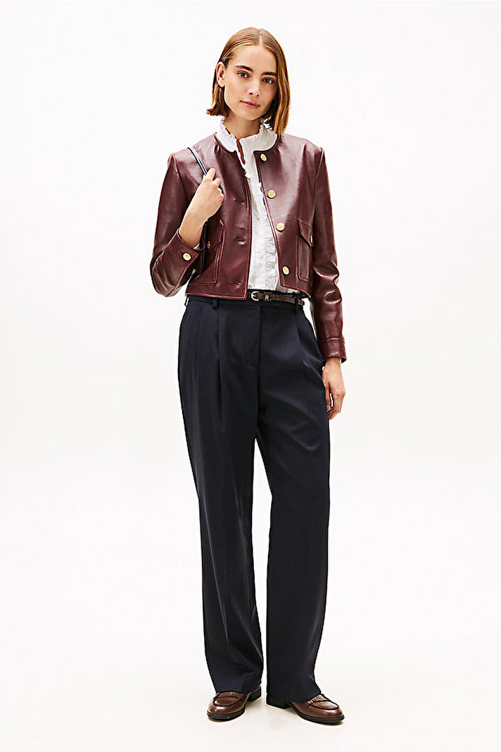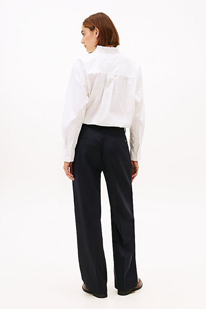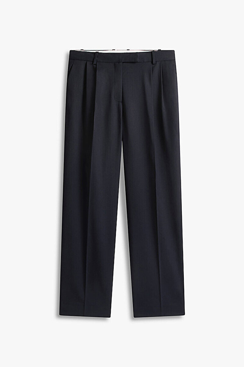 Klasik terziliği modern bir silüetle birleştiren bu pantolon, gardırobunuza zamansız bir şıklık katıyor. Yün karışımlı kumaşı, sofistike bir dokunuş sunarken, geniş paça (wide leg) kesimi rahat ve akıcı bir görünüm sağlar. Ön kısımdaki pile detayları ve bacak boyu devam eden keskin ütü çizgileri, pantolona profesyonel ve zarif bir hava katar. Fermuarlı ve kancalı kapamasıyla tamamlanan bu parça, hem ofis stili hem de şık günlük kombinler için idealdir.