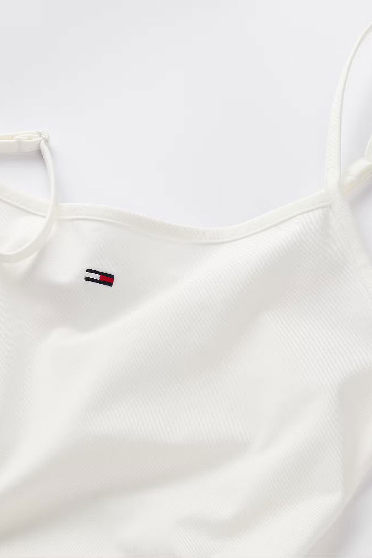 Tommy Hilfiger’ın ince askılı, minimal tasarımlı t-shirt üstü; temiz beyaz rengi ve göğüs hizasındaki küçük bayrak logosuyla sade şıklığı vurgular. Esnek pamuk-elastan karışımı kumaşıyla vücuda nazikçe oturur, hareket özgürlüğünüzü kısıtlamadan rahatlık sunar.