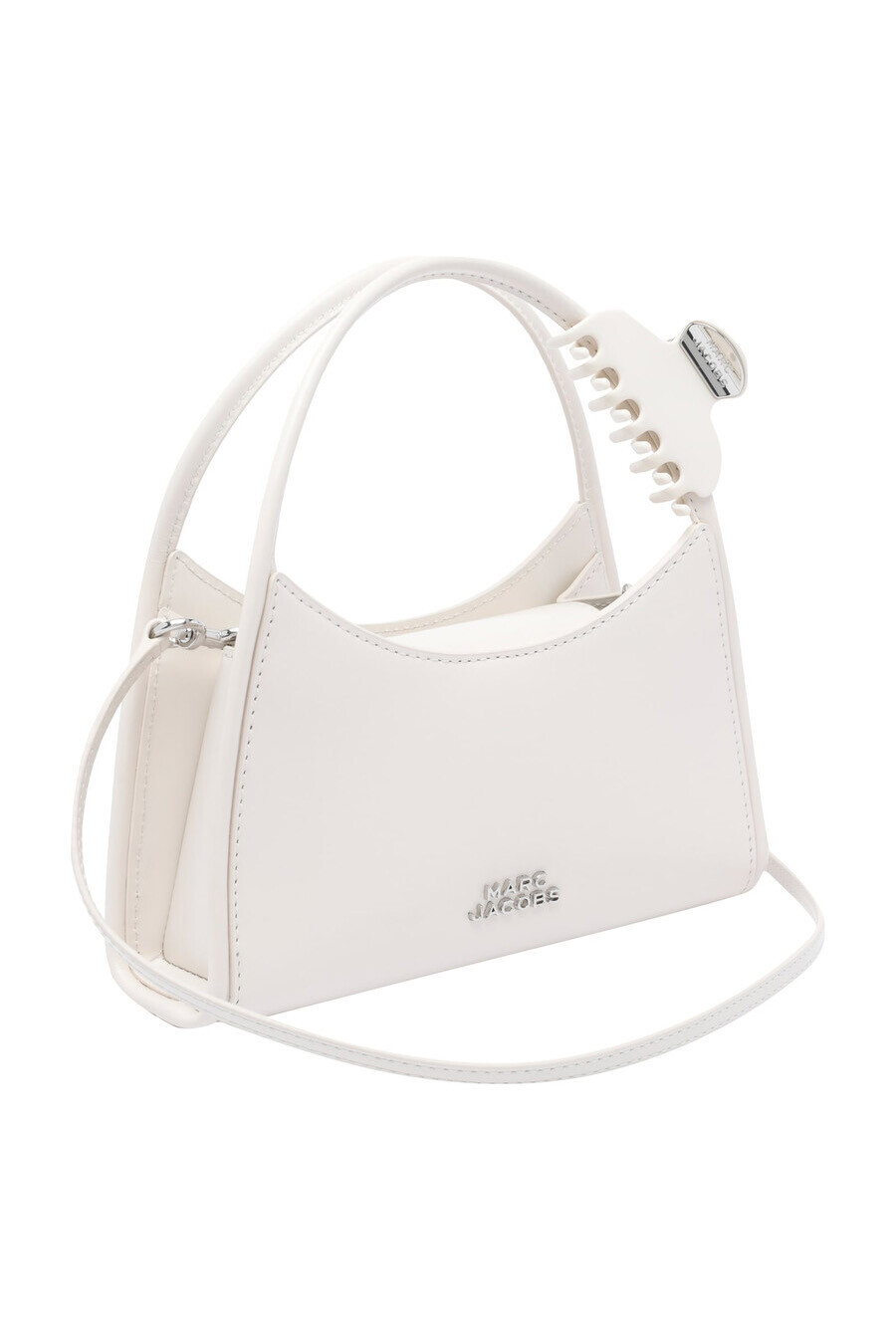 Beyaz renk tonunun zarafetini modern bir tasarımla buluşturan çanta, koleksiyonunuzun en dikkat çekici parçası olacak. Pürüzsüz sığır derisinden üretilen bu çanta, kavisli ve yapısal formuyla sofistike bir duruş sergiler. Tasarımın en çarpıcı detayı olan sap kısmındaki ikonik 'kıskaç toka', stilinize eğlenceli ve özgün bir dokunuş katar. Sabit el sapıyla klasik bir el çantası olarak kullanabileceğiniz gibi, çıkarılabilir uzun askısı sayesinde omzunuza asarak veya çapraz takarak kullanım çeşitliliği yaratabilirsiniz. Minimalist ön yüzü ve kompakt boyutlarıyla hem gündüz hem gece şıklığınıza eşlik eder.