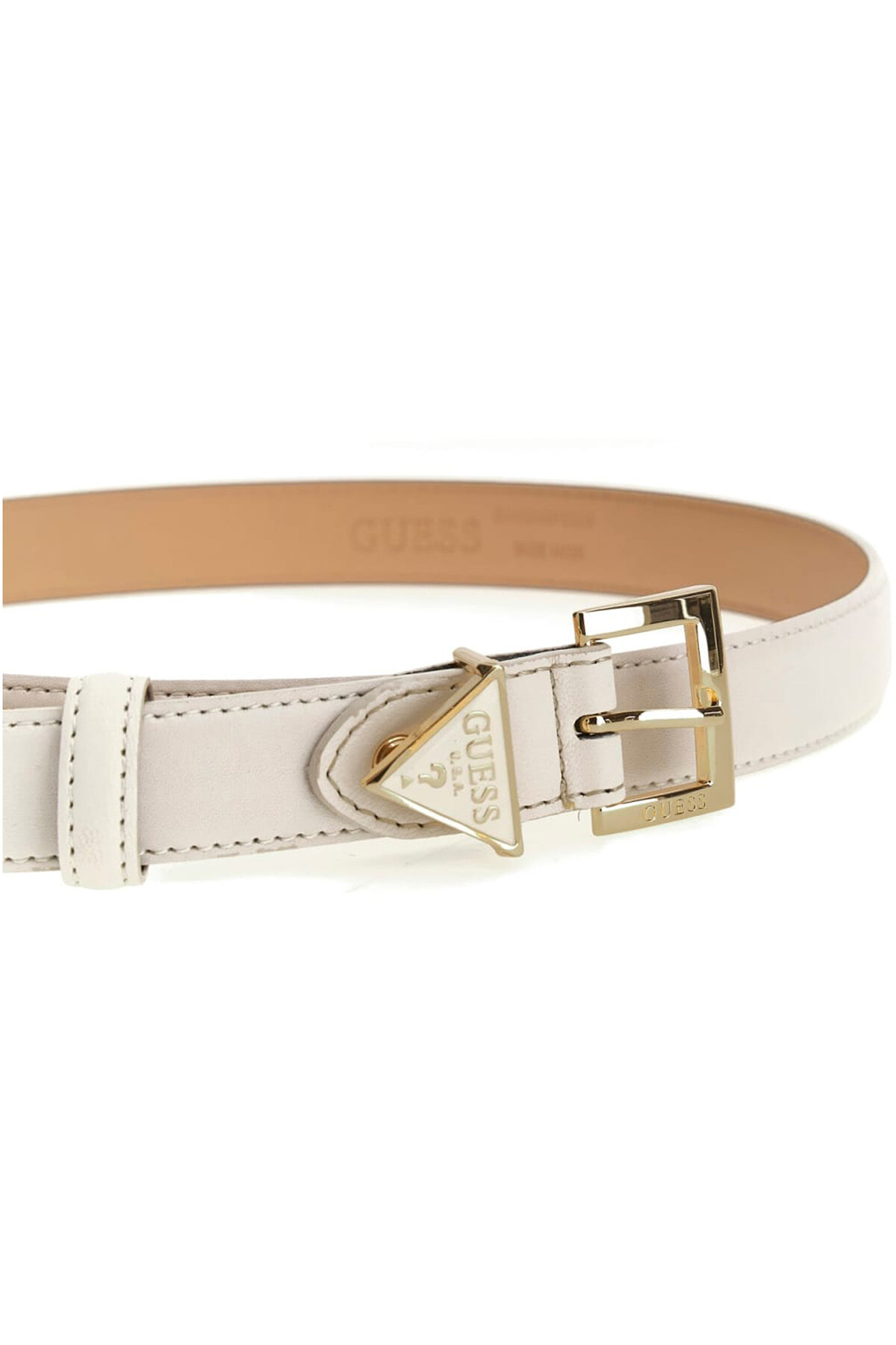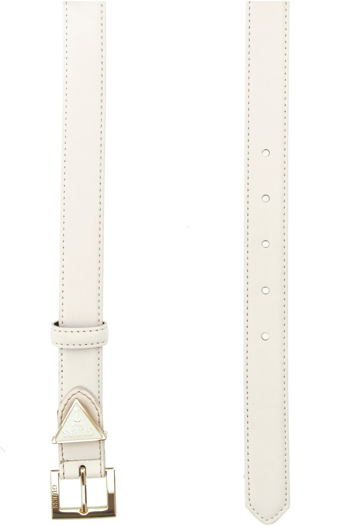 Klasik zarafeti modern bir dokunuşla birleştiren bu kemer, her kombini tamamlamak için ideal bir aksesuardır. Pürüzsüz beyaz kayış, parlak altın rengi toka ile şık bir kontrast oluşturur. Tasarımın en dikkat çekici unsuru, kemer köprüsü olarak kullanılan ikonik üçgen formlu metal aksesuardır. Ayarlanabilir yapısı sayesinde mükemmel bir uyum sağlayan bu kemer, elbiselerden pantolonlara kadar geniş bir kullanım alanı sunar.