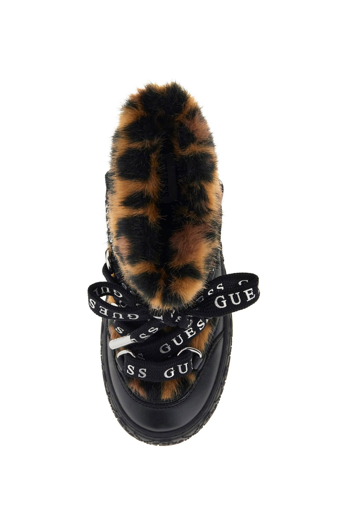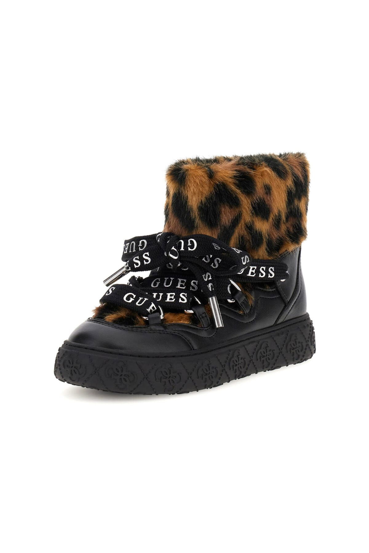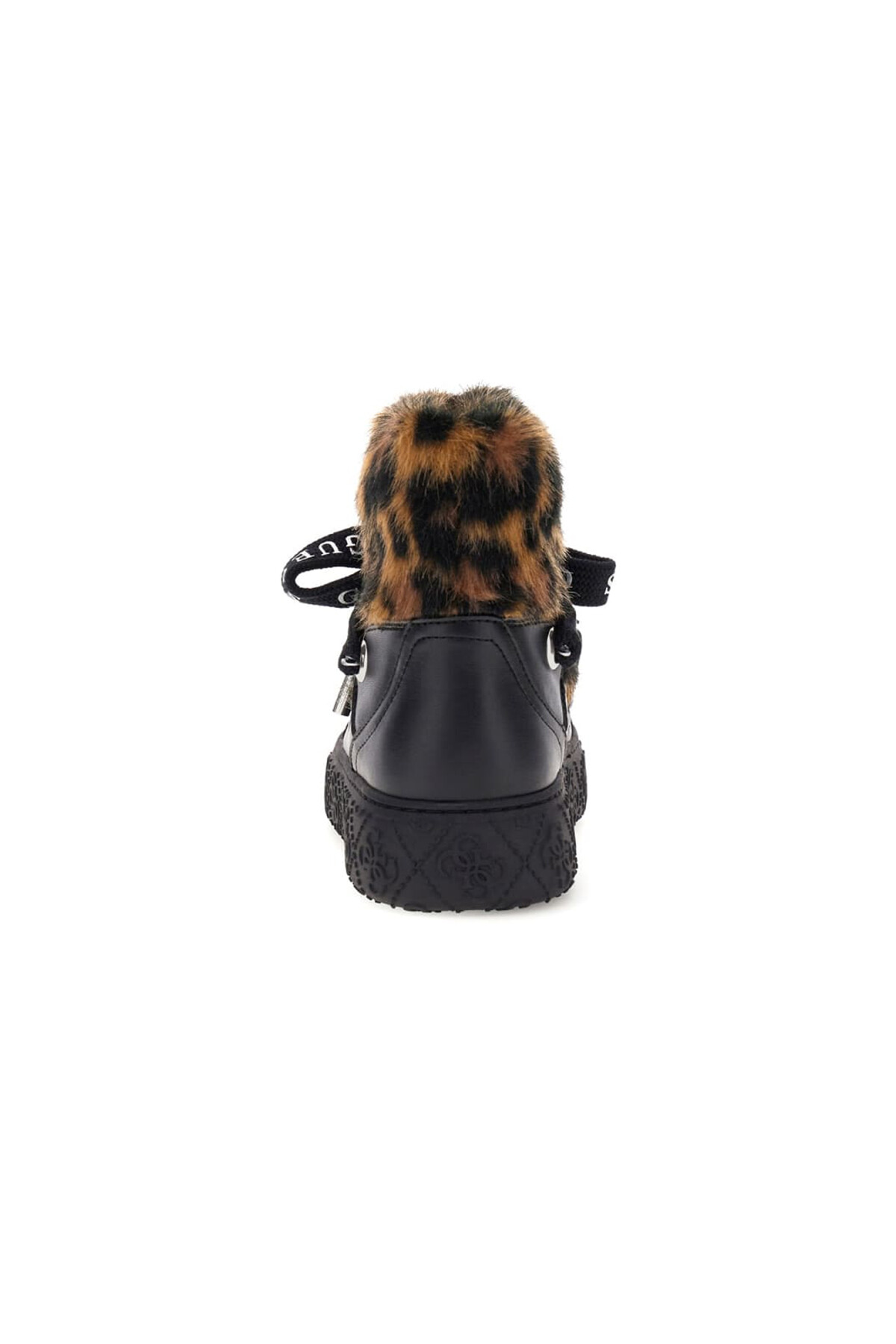 Kış stiline iddialı bir dokunuş katan bu bot, sıcak tutan yapısıyla ve göz alıcı tasarımıyla öne çıkar. Siyah suni deri gövde, bilek kısmını ve dili tamamen saran yumuşak, leopar desenli kürk detayıyla zenginleştirilmiştir. Üzerinde yazı baskıları bulunan geniş bağcıkları, modelin modern karakterini vurgular. Kabartma desenli kalın platform tabanı ise hem konforlu bir kullanım sunar hem de tasarıma güçlü bir son dokunuş yapar.