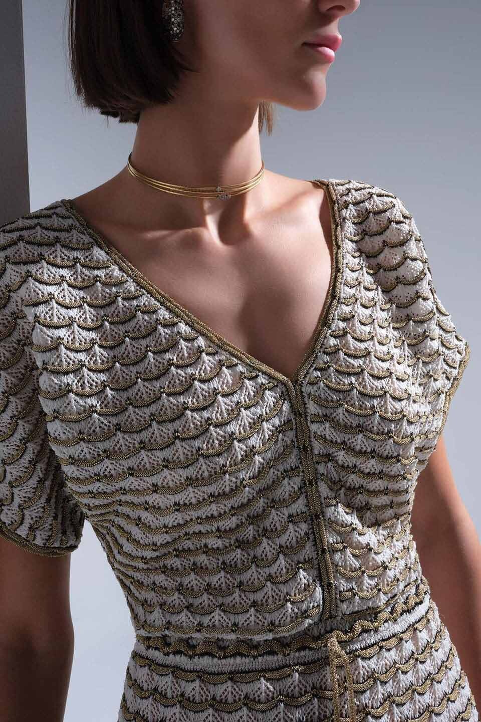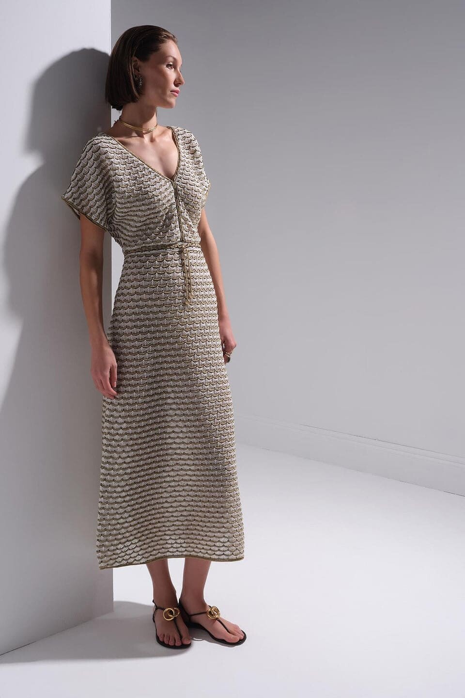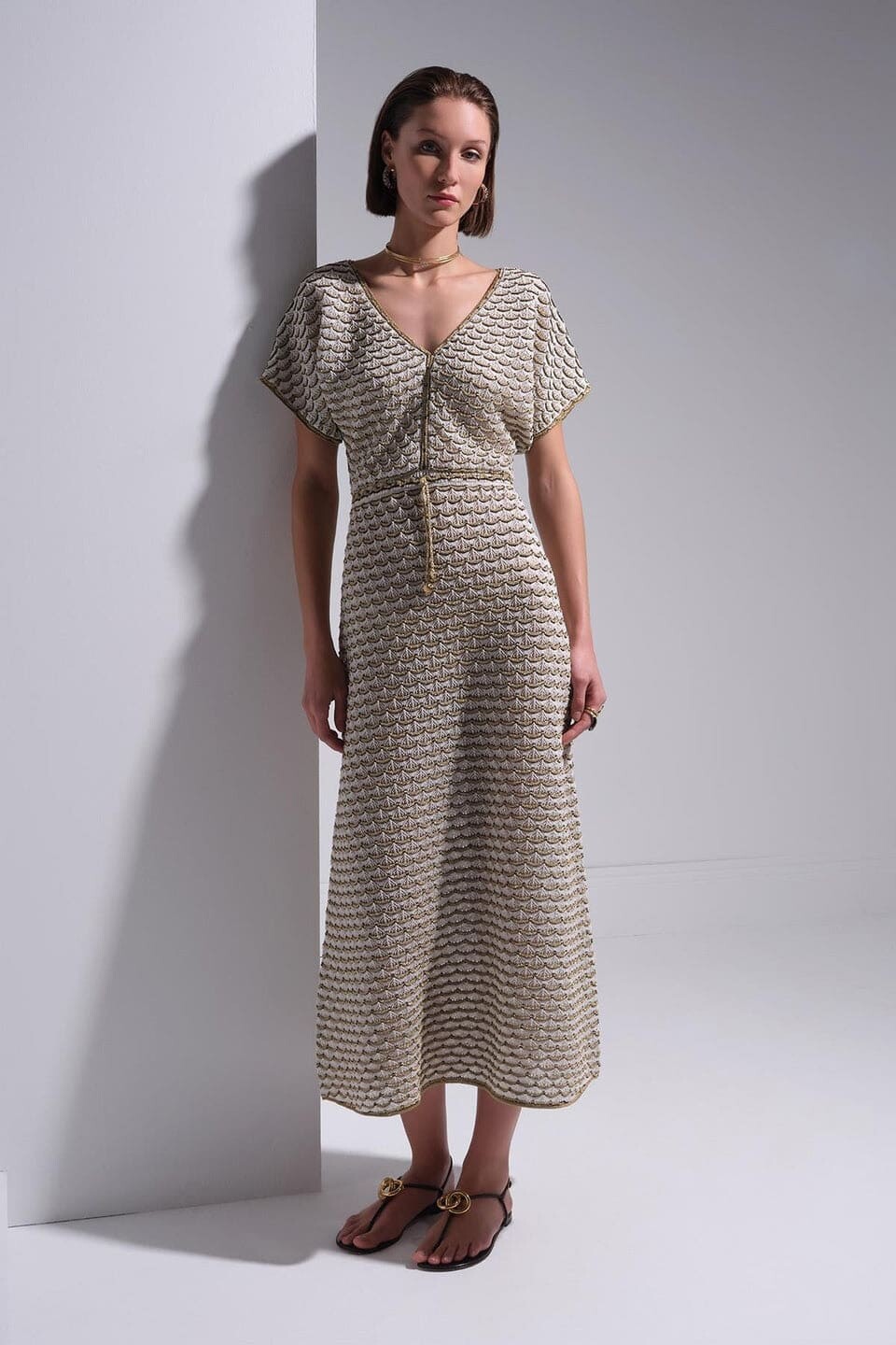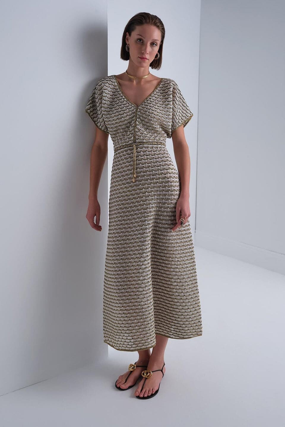 Kadın V Yaka Beli Lastikli Midi Elbise - Bej