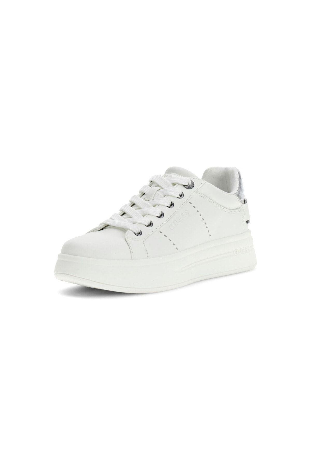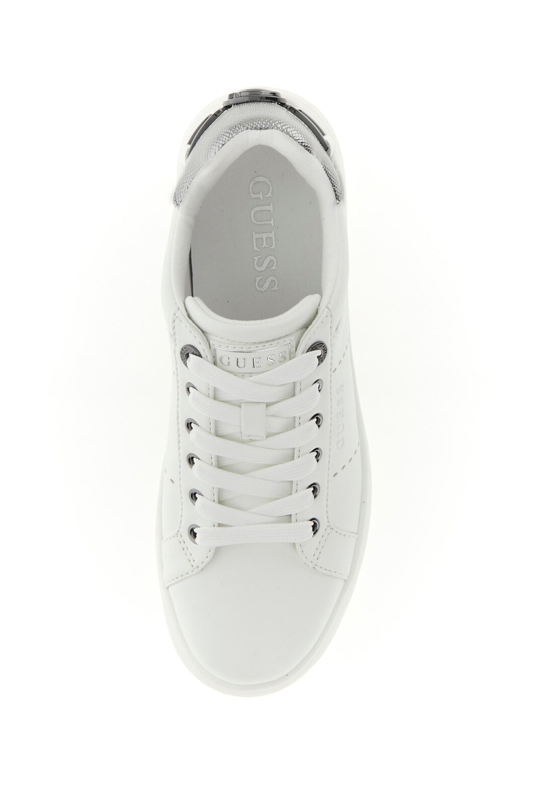 Detay: Topukta gümüş renkli metalik panel, metal "G" logo aksesuarı, yan panelde Guess yazı logosu, yüksek beyaz dış taban