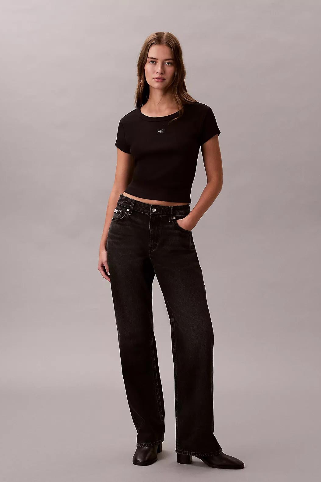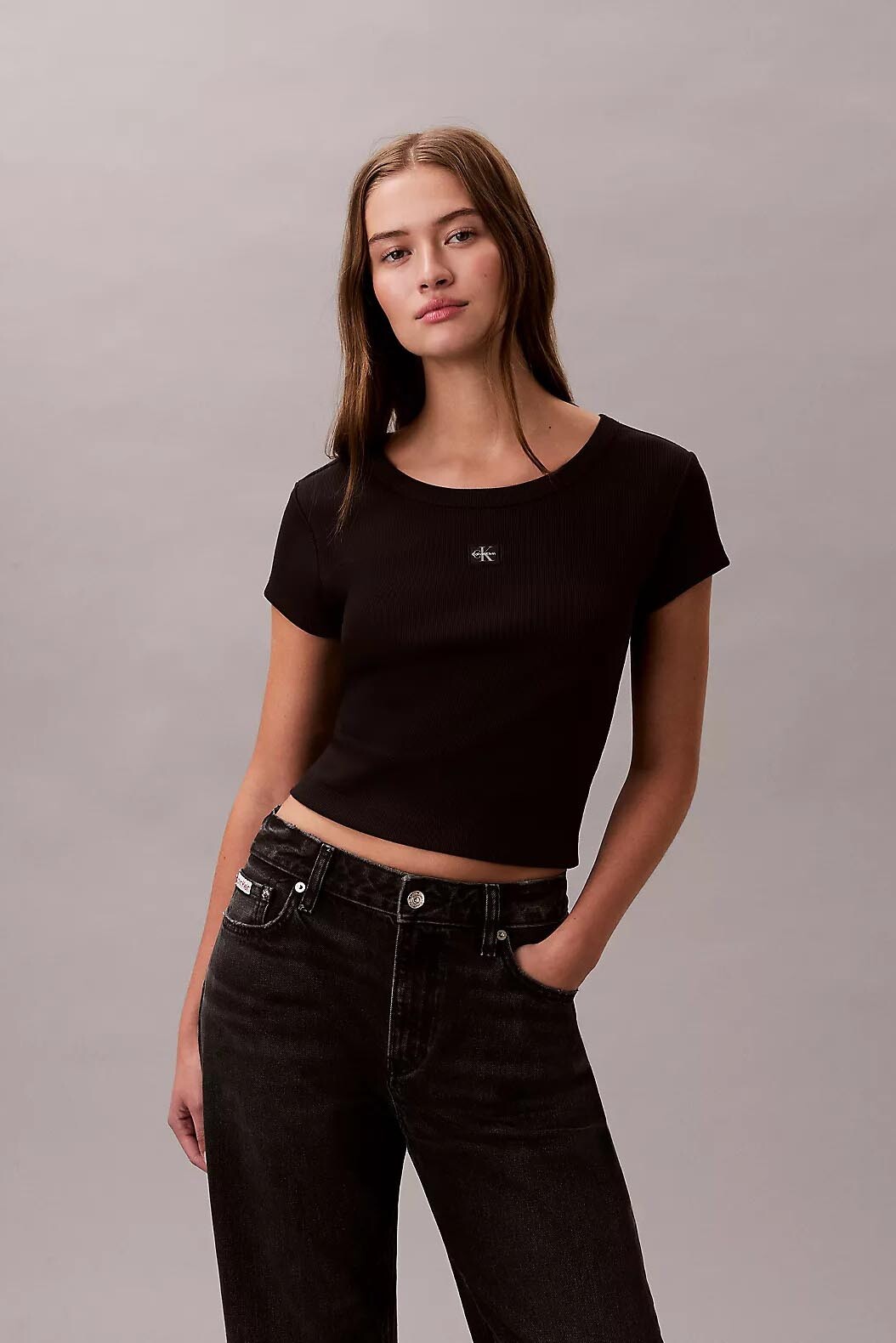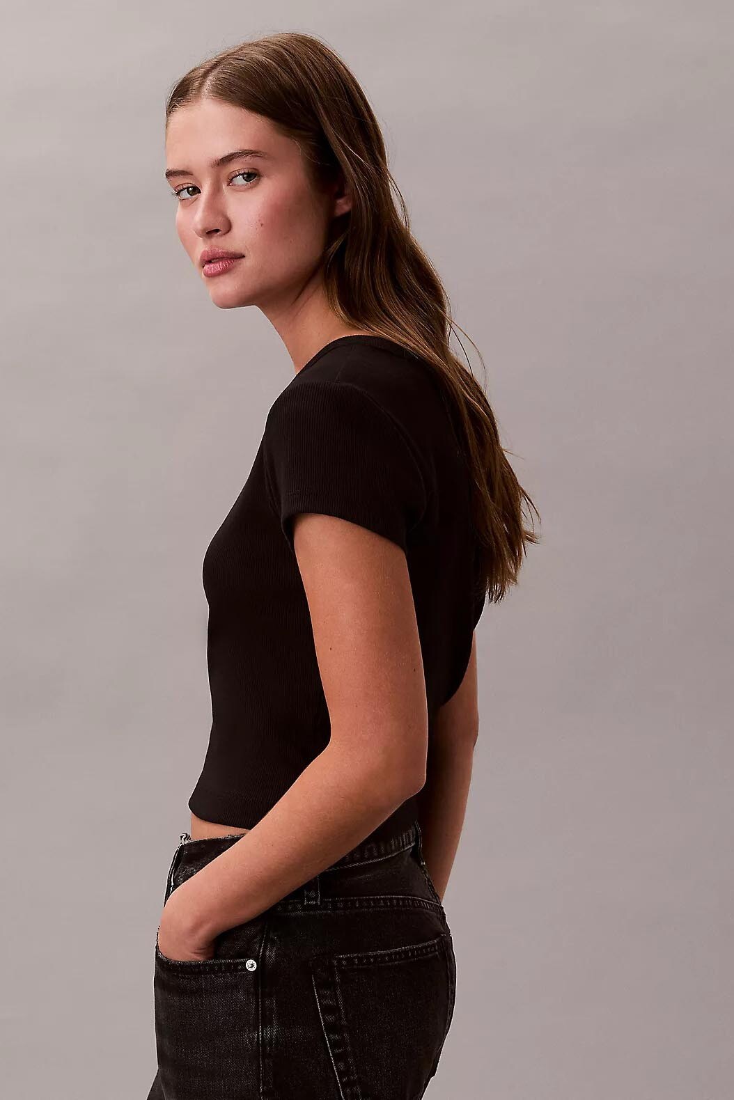 Tasarımın ön panelinde yer alan ikonik dokuma marka etiketi (woven label), t-shirt'e modern ve karakteristik bir imza kazandırır. Kısa kollu tasarımı, zarif bisiklet yakası ve kısa (cropped) kesimiyle dinamik bir silüet çizen bu parça, tam kalıp özellikleri sayesinde ideal bir duruş sunar. Astarsız ve fermuarsız yapısıyla sade şıklığı ön plana çıkaran t-shirt, 48 cm uzunluğuyla modern bir form sergiler.
