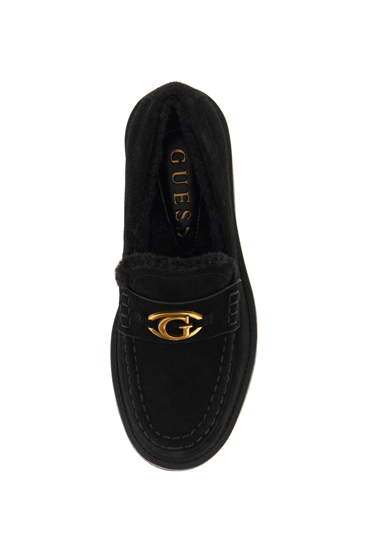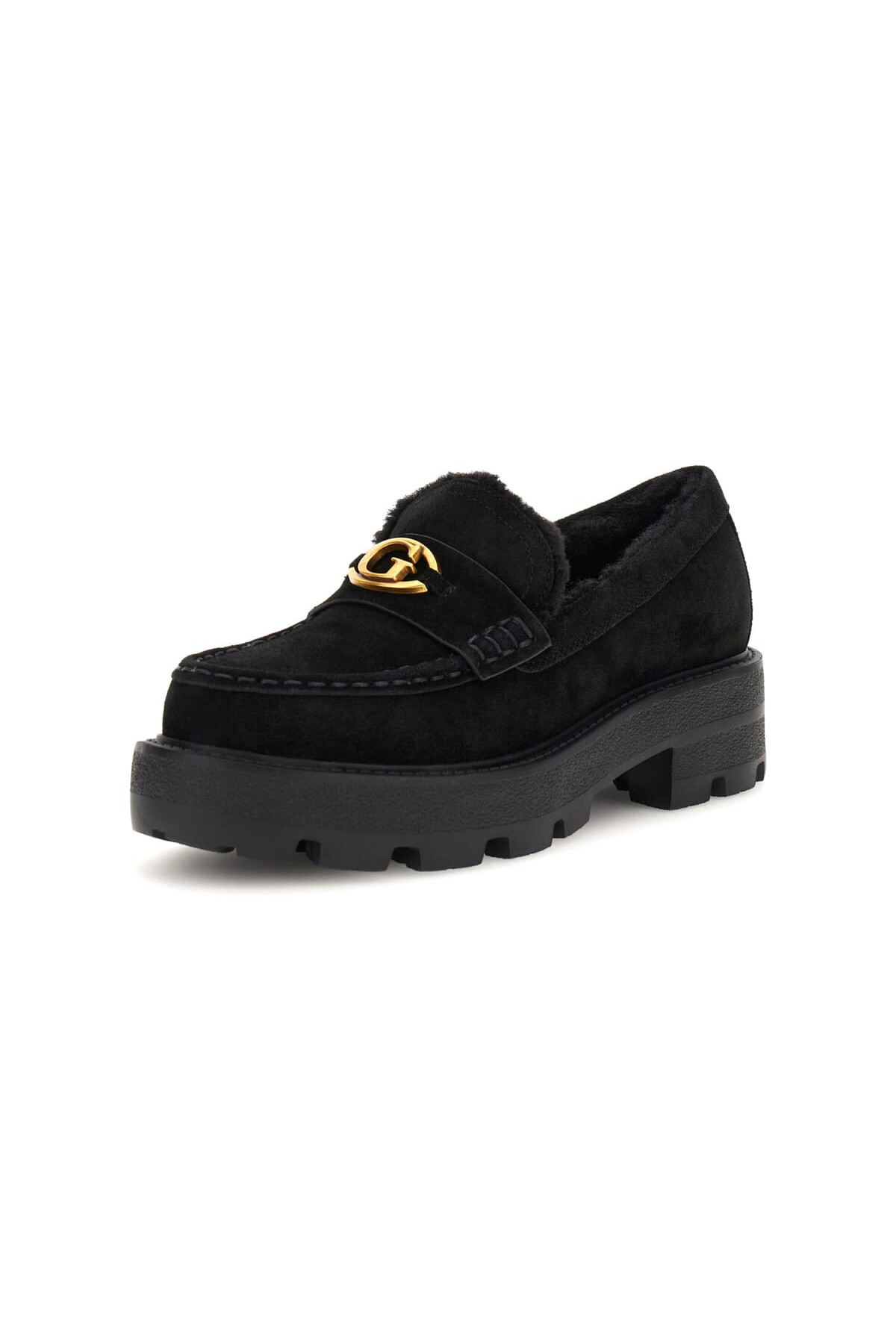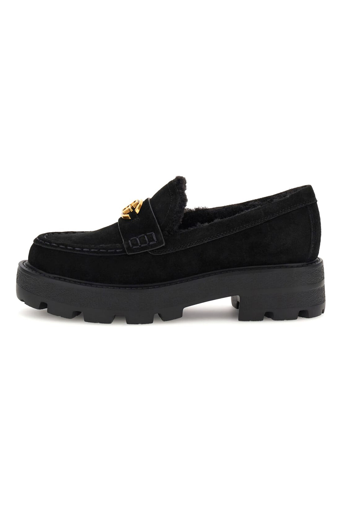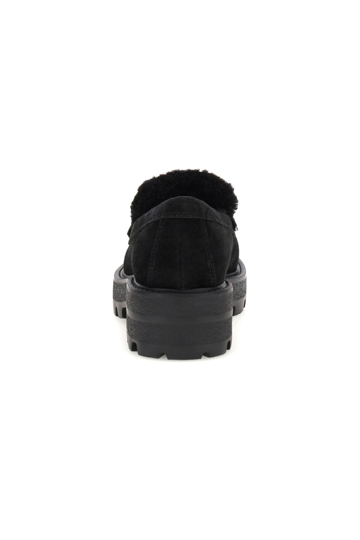 Klasik makosen stilini kış aylarına uygun modern bir tasarımla buluşturan bu model, hem sıcak tutar hem de iddialı bir görünüm sunar. Siyah süet gövdesi, içini tamamen kaplayan yumuşak kürk astarla birleşerek üstün konfor sağlar. Kalın ve tırtıklı traktör tabanı, güncel trendleri yansıtırken sağlam bir duruş sergiler. Üst bandı süsleyen parlak altın rengi metal harf aksesuarı, bu konforlu tasarıma lüks bir dokunuş katar.