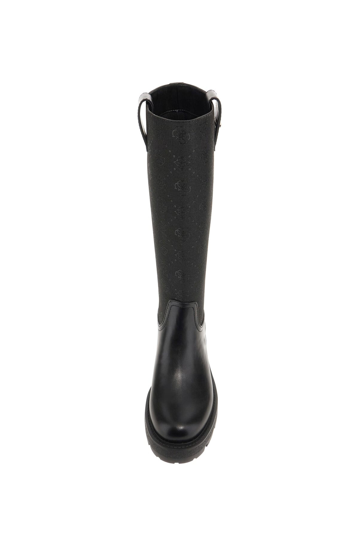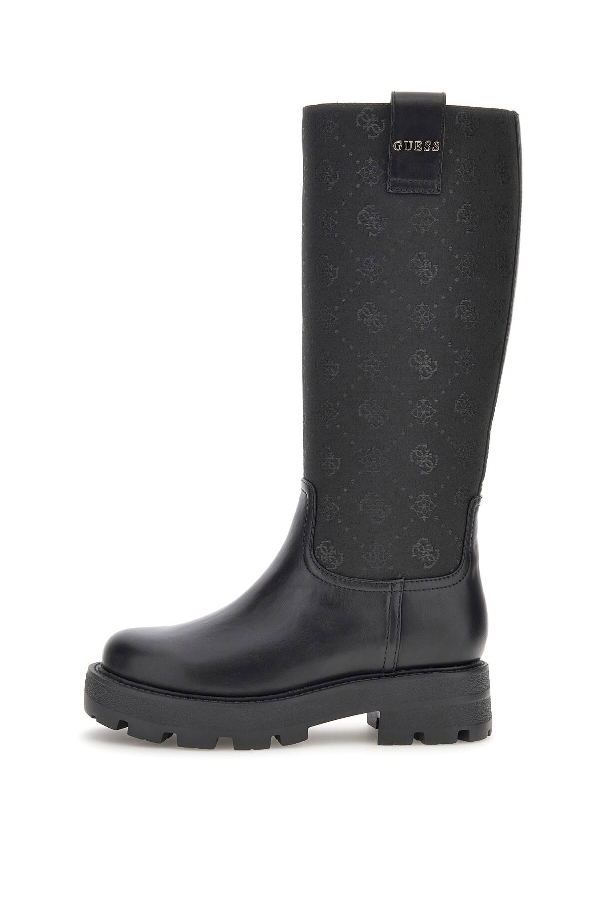 Klasik binici çizmesi stilini modern detaylarla birleştiren bu model, iddialı ve şık bir görünüm sunar. Ayak kısmı pürüzsüz suni deriden oluşurken, bacak kısmı baştan sona markanın ikonik tonal monogram deseniyle kaplanmıştır. Bu ikili doku, monokrom tasarıma zengin bir estetik katmaktadır. Modelin kalın ve tırtıklı traktör tabanı, hem güncel modayı yansıtır hem de konforlu bir kullanım sağlar. Üst kısımdaki çekme halkaları giyim kolaylığı sunar.