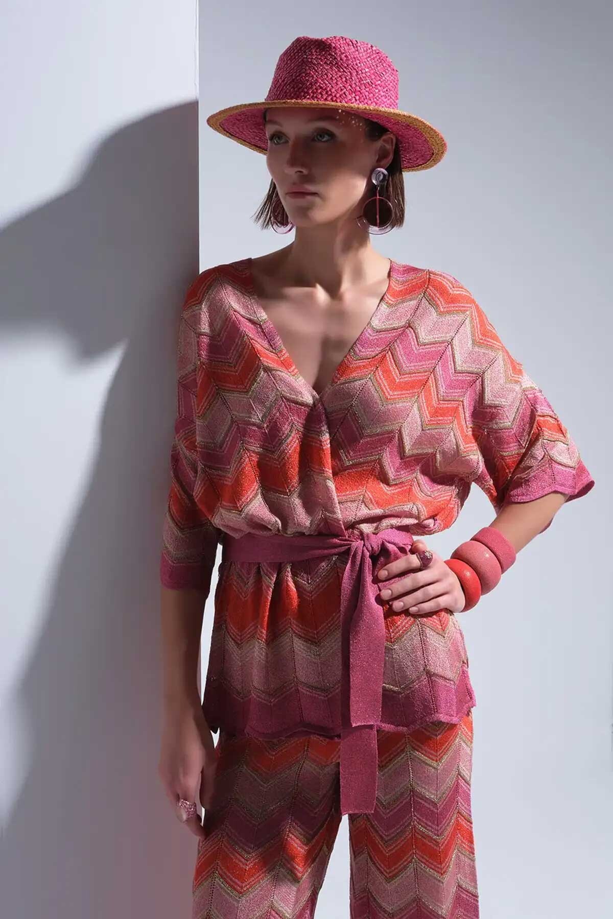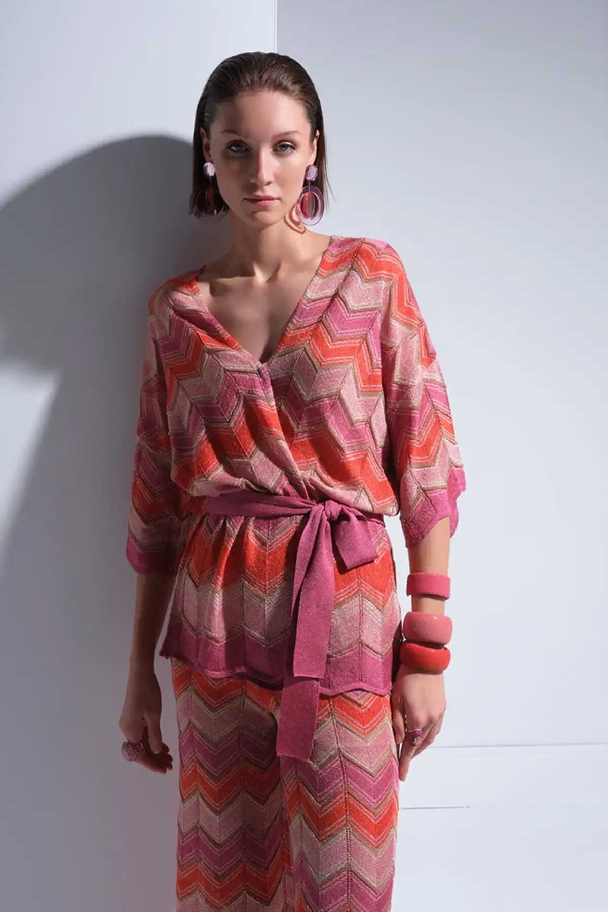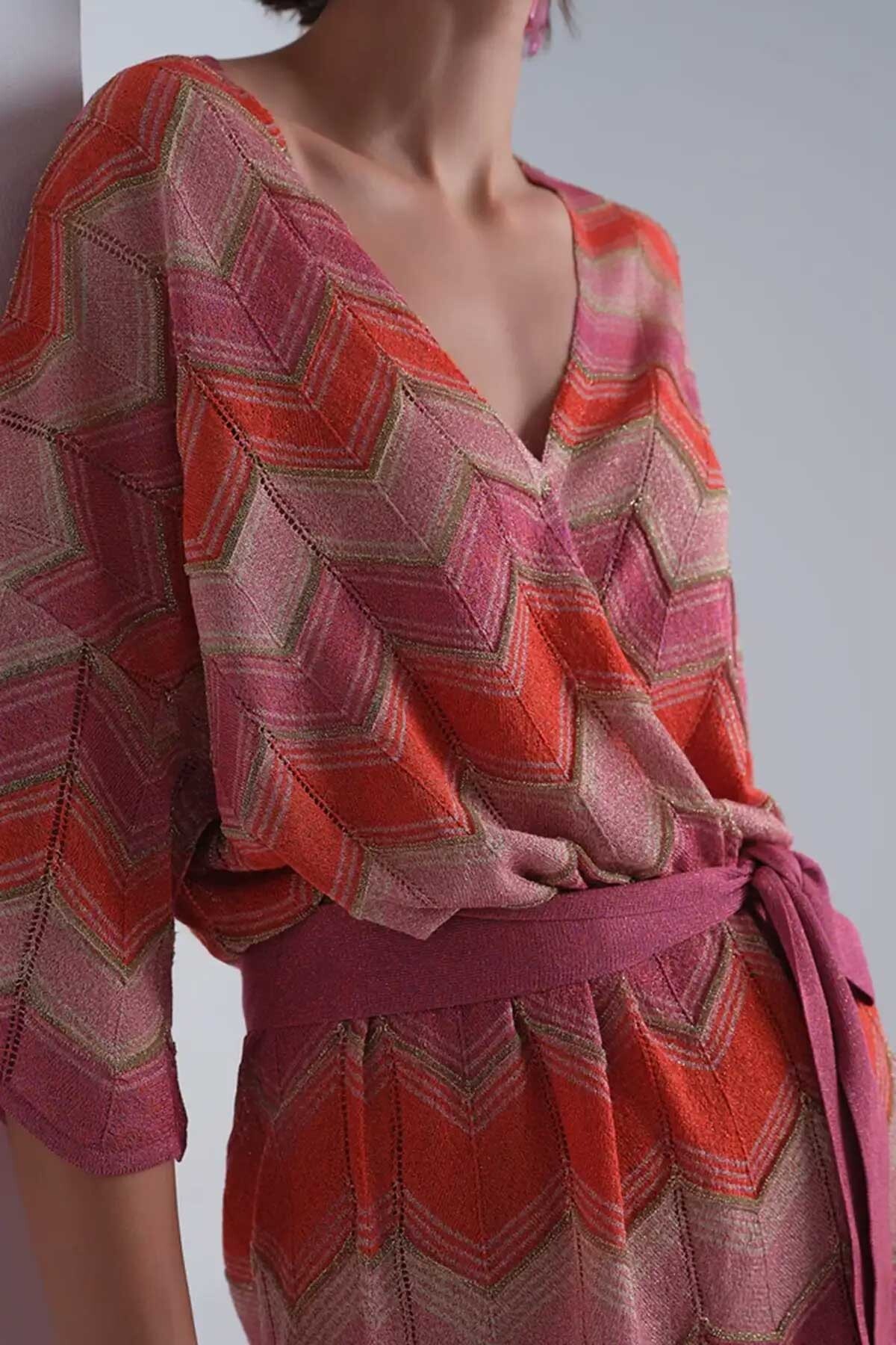 Kadın Zikzak Desenli Beli Kemerli Simli Multi Hırka - Mix