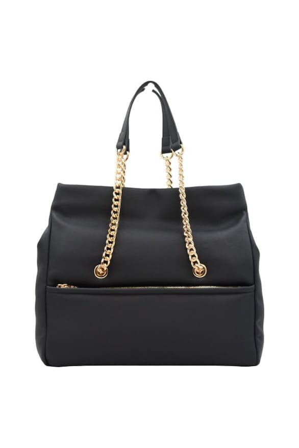 Geniş iç hacmi ve modern tasarımıyla dikkat çeken bu omuz çantası, hem şıklığı hem de fonksiyonelliği bir arada sunuyor. Pürüzsüz poliüretan yüzeyi, ön kısımdaki büyük ve parlak altın rengi metal harf detaylarıyla zenginleştirilerek iddialı bir görünüm kazanmıştır. Zincir detaylı omuz askıları, konforlu kullanım için poliüretan tutma yerleri ile tamamlanmıştır. Arka kısmında yer alan fermuarlı cep, sık kullandığınız eşyalara kolay erişim sağlarken, geniş iç yapısı günlük tüm ihtiyaçlarınızı taşımanız için idealdir.