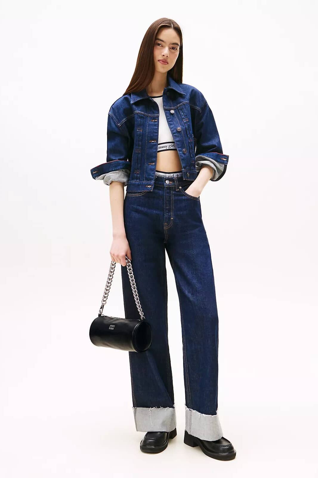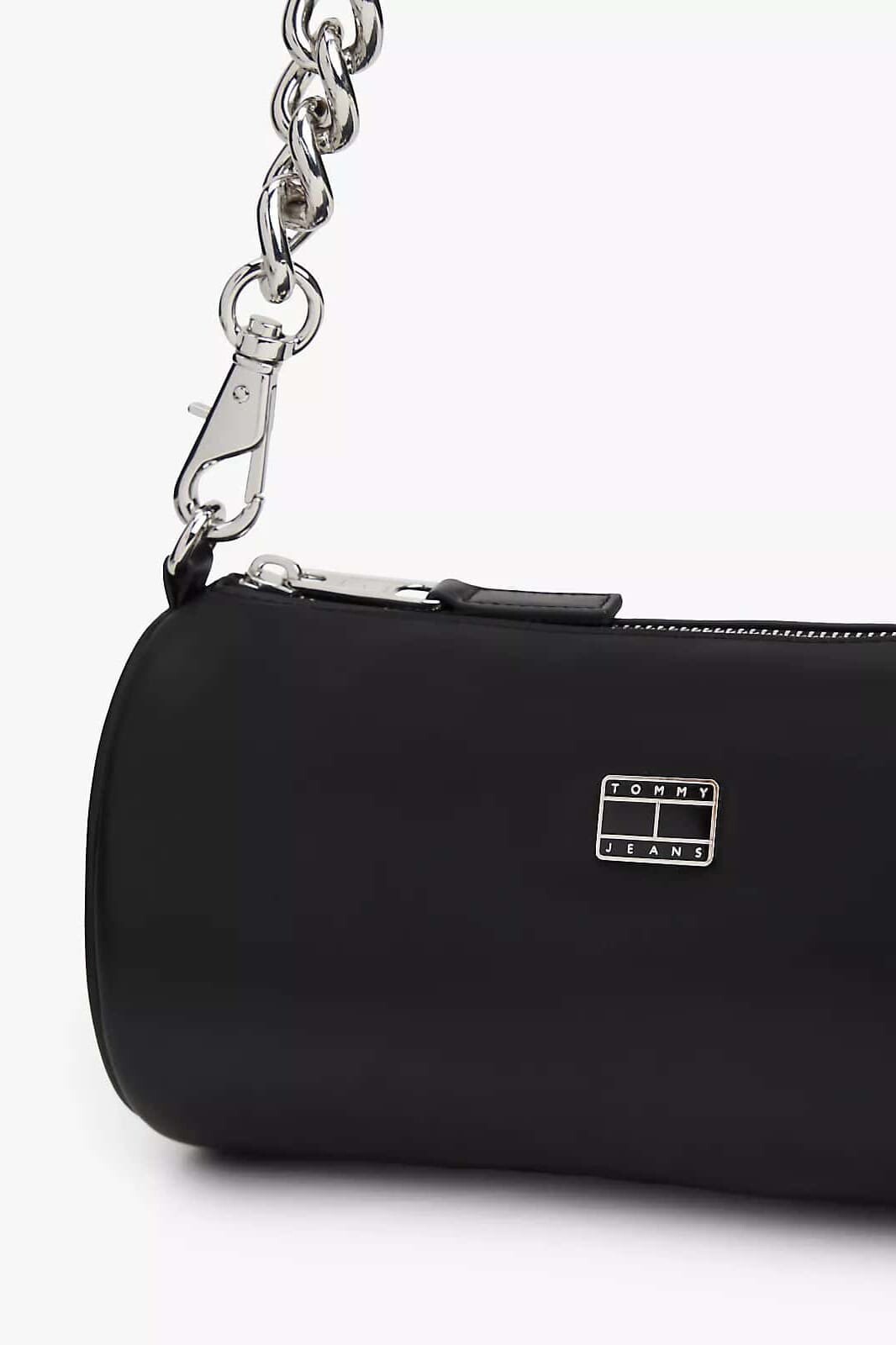 Her kombine modern ve iddialı bir dokunuş katacak bu çanta, şık ve minimalist tasarımıyla öne çıkıyor. Pürüzsüz poliüretan malzemeden üretilen zarif silindir formu, parlak ve kalın metal zincir omuz askısıyla kontrast oluşturarak cesur bir stil ifadesi sunar. Fermuarlı ana bölmesi temel eşyalarınız için güvenli bir saklama alanı sağlarken, ön yüzündeki metal logo plakası tasarıma zarif bir son dokunuş yapar. Klasik siyah rengiyle hem gündüz hem de gece stilleriniz için mükemmel bir aksesuardır.