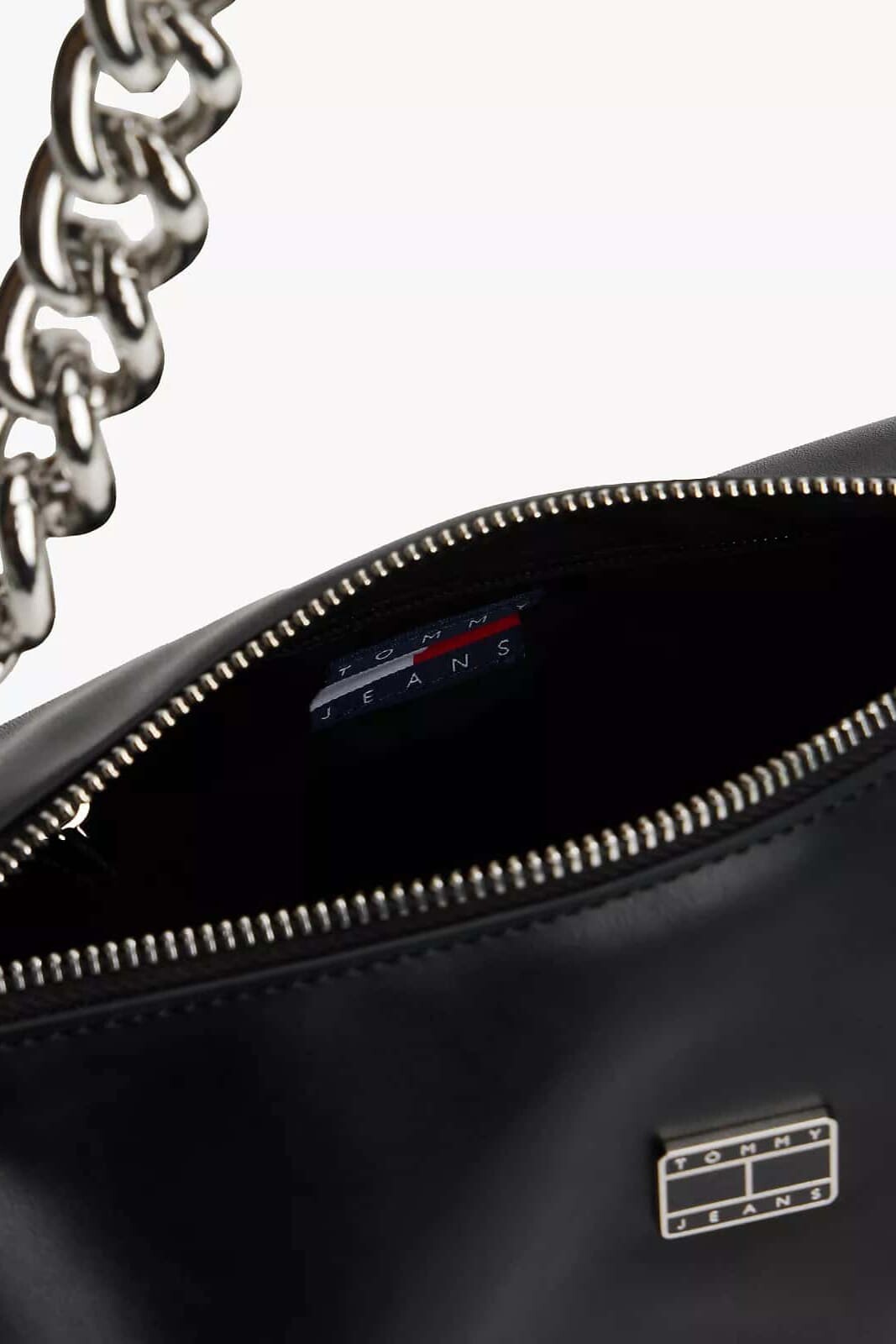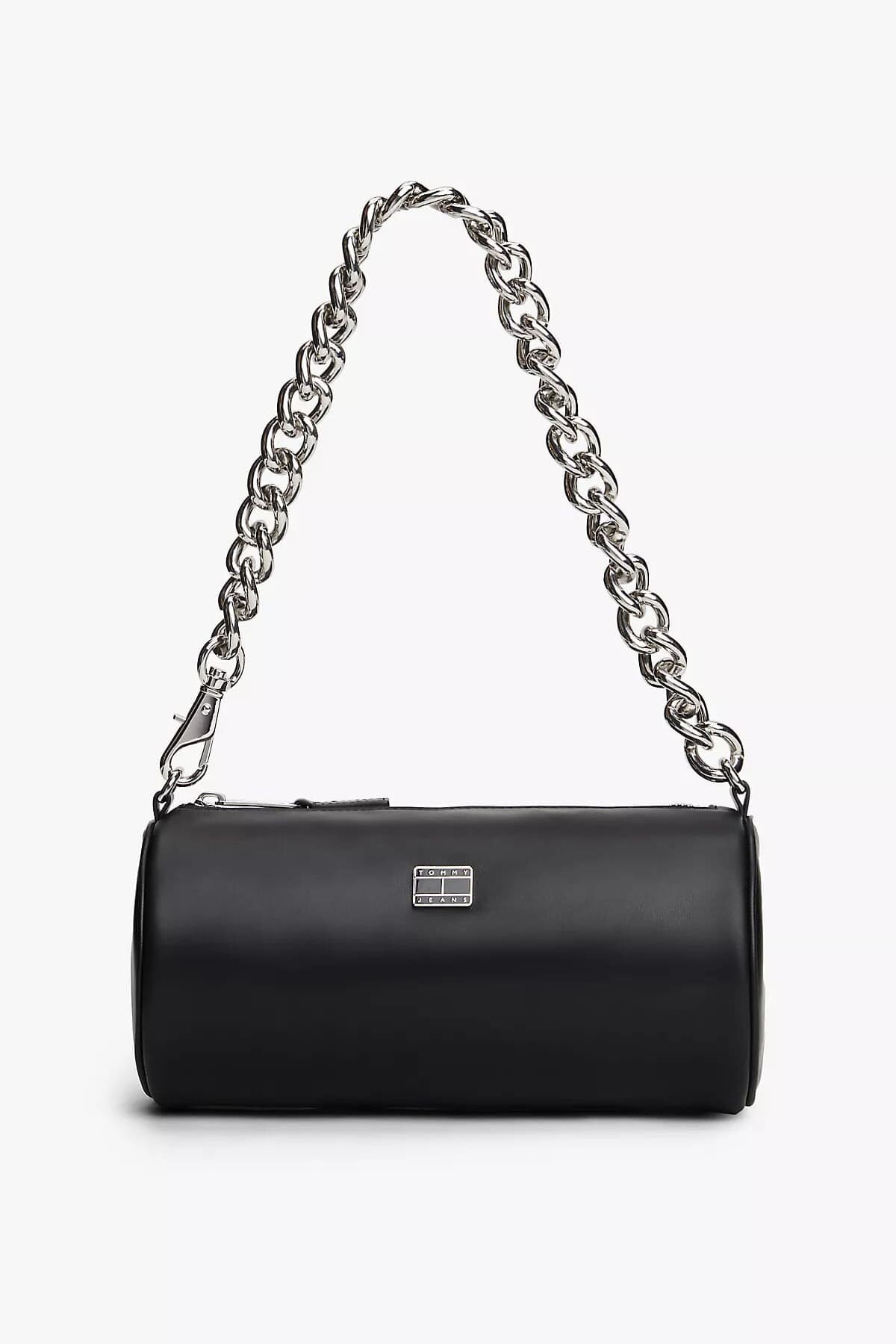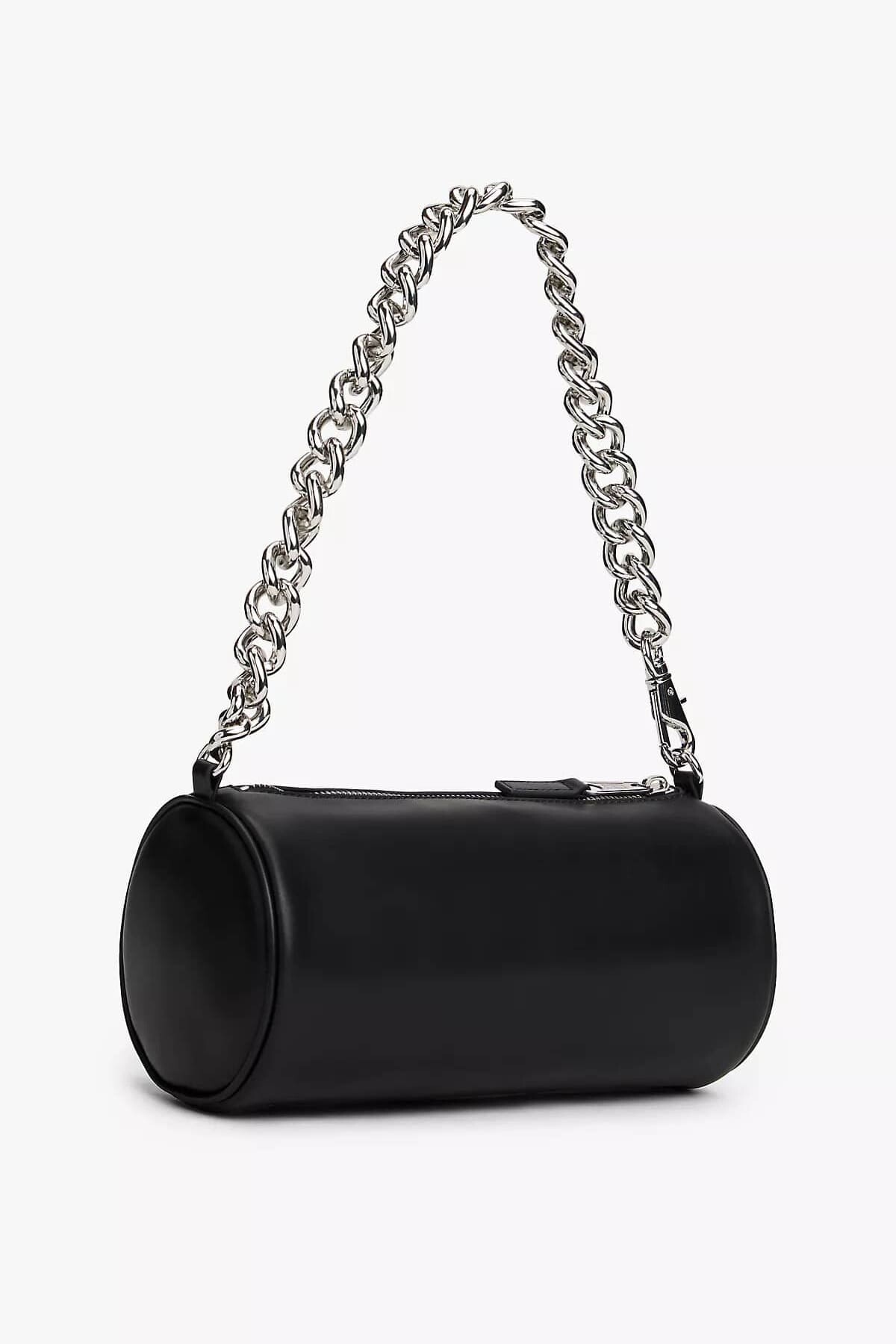 Her kombine modern ve iddialı bir dokunuş katacak bu çanta, şık ve minimalist tasarımıyla öne çıkıyor. Pürüzsüz poliüretan malzemeden üretilen zarif silindir formu, parlak ve kalın metal zincir omuz askısıyla kontrast oluşturarak cesur bir stil ifadesi sunar. Fermuarlı ana bölmesi temel eşyalarınız için güvenli bir saklama alanı sağlarken, ön yüzündeki metal logo plakası tasarıma zarif bir son dokunuş yapar. Klasik siyah rengiyle hem gündüz hem de gece stilleriniz için mükemmel bir aksesuardır.