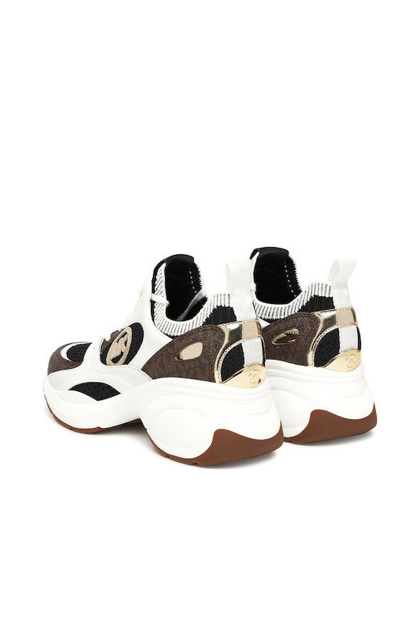 Günlük stilinize iddialı bir dokunuş katacak bu chunky sneakers, dikkat çekici tasarımıyla öne çıkıyor. Kontrast renk blokları; beyaz, siyah ve dokulu kahverengi panelleri dinamik bir şekilde bir araya getirir. Nefes alabilen file/knit paneller konfor sağlarken, yan tarafta konumlanan büyük, işlemeli dairesel amblem tasarıma lüks bir imza atar. Hacimli ve yastıklamalı kalın beyaz tabanı, modern bir silüet sunarken gün boyu rahat adımlar vadeder.