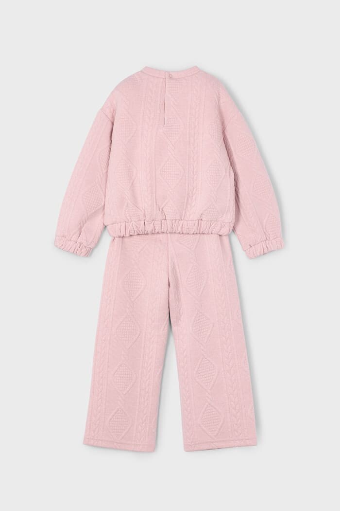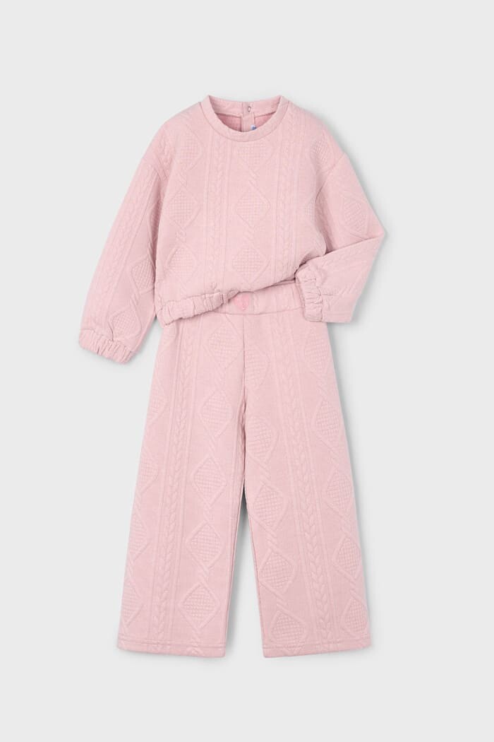 Zarafet ve konforu bir araya getiren bu iki parçalı pembe takım, miniklerin gardırobuna tatlı bir stil katıyor. Yumuşak, esnek ve özel dokulu kumaşı, gün boyu rahatlık ve hareket özgürlüğü sunar. Takımın tamamına yayılan şık baklava desenli kabartma dokusu, tasarıma klasik ve zarif bir hava kazandırır. Rahat kesimli sweatshirt ve trend bir görünüm sunan geniş paça pantolondan oluşan set, hem günlük kullanım hem de özel günler için harika bir alternatiftir. Ensede bulunan küçük düğme detayı giyim kolaylığı sağlarken, elastik bel yapısı konforu ön planda tutar. Bu takım, çocukların oyun saatlerinde bile şıklığından ödün vermemesini sağlar.