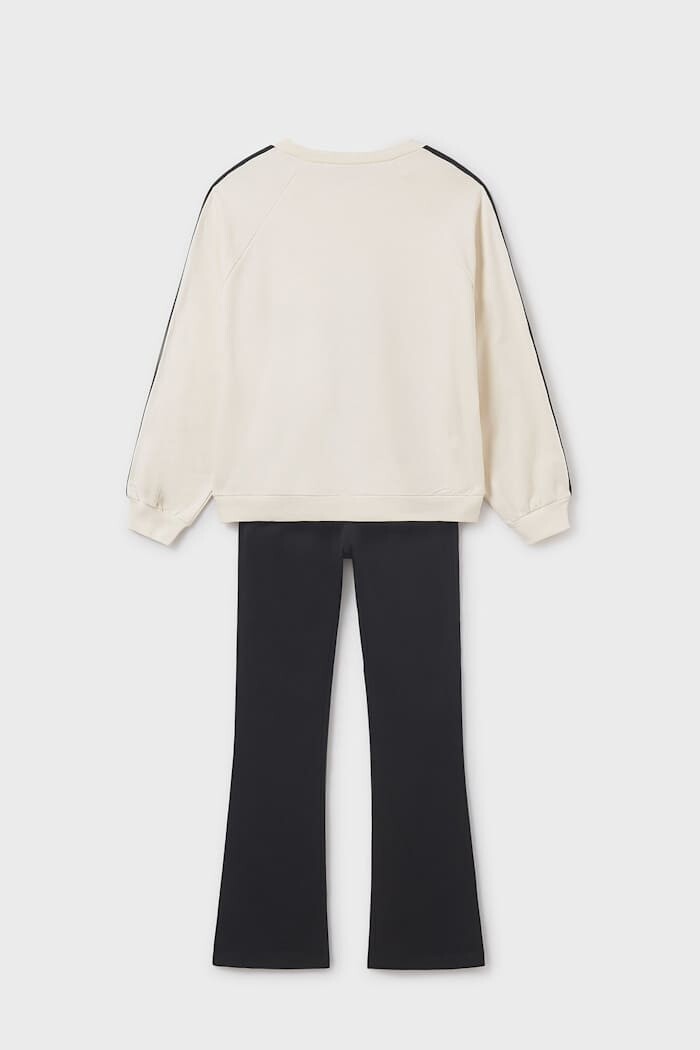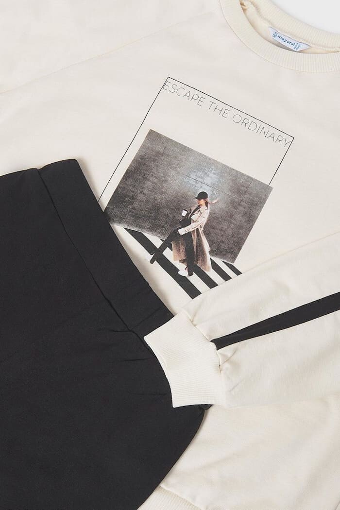 Sokak modasının rahatlığını ve şık detayları bir araya getiren bu iki parçalı takım, çocukların dinamik ruhunu yansıtıyor. Yüksek pamuk oranına sahip esnek kumaşı, gün boyu konfor ve hareket özgürlüğü sunar. Krem rengi sweatshirt'ün önündeki "Escape the Ordinary" (Sıradanlıktan Kaç) temalı fotoğrafik baskı ve kollarındaki siyah şeritler, tasarıma modern ve sportif bir hava katıyor. Takımı tamamlayan siyah İspanyol paça tayt ise hem son derece trend bir görünüm sunar hem de esnek yapısıyla rahat bir kullanım sağlar.