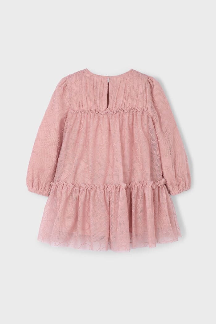 Özel günlere zarafet katmak için tasarlanan bu elbise, incelikli detayları ve romantik tasarımıyla göz kamaştırıyor. Tamamı desenli, fantazi tül kumaştan üretilen elbise, her adımda hafif ve havalı bir görünüm sunar. Pamuk karışımlı yumuşak astarı, çocuğunuzun gün boyu konforlu hissetmesini sağlar. Gövdesindeki ve kat kat eteklerindeki büzgülü detaylar tasarıma hareket ve hacim katarken, uzun kolları serin havalarda şıklıktan ödün vermeden koruma sunar. Doğum günleri, partiler ve tüm özel kutlamalar için adeta bir rüya gibi bir seçenektir.