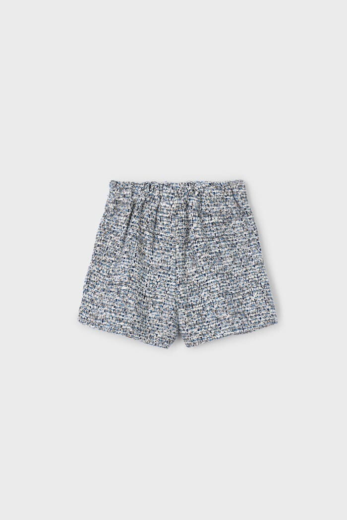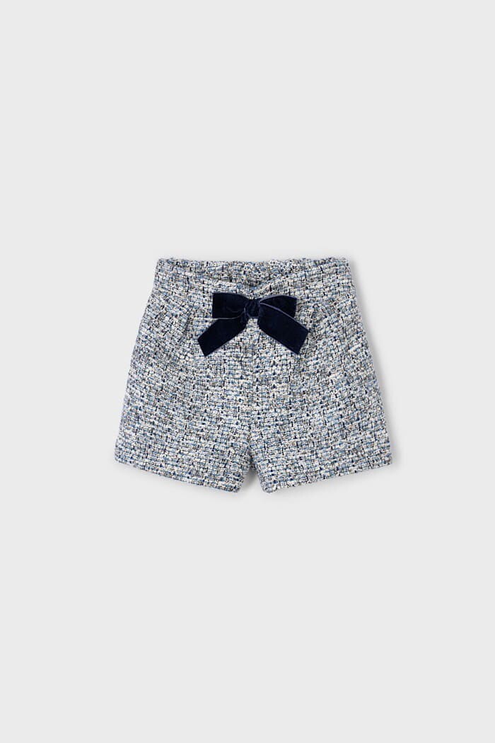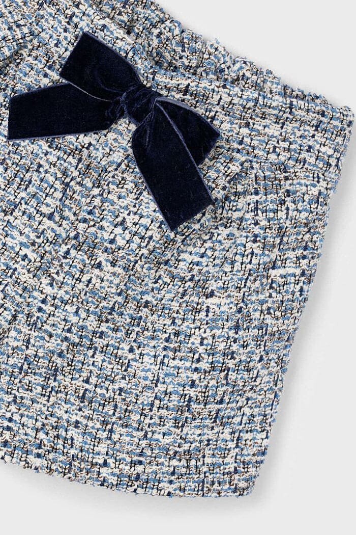 Klasik tüvit kumaşın zarafetini sevimli detaylarla birleştiren bu şort, özel günler için sofistike bir seçenektir. Zengin dokulu kumaşı, içerisindeki metalik iplikler sayesinde zarif bir ışıltıya sahiptir. Bel kısmını süsleyen büyük ve lüks kadife fiyonk detayı, tasarıma göz alıcı ve şık bir dokunuş katıyor. Külotlu çoraplar ve şık bir bluz ile tamamlandığında, soğuk havalardaki kutlamalar ve özel davetler için mükemmel bir kombin oluşturur.