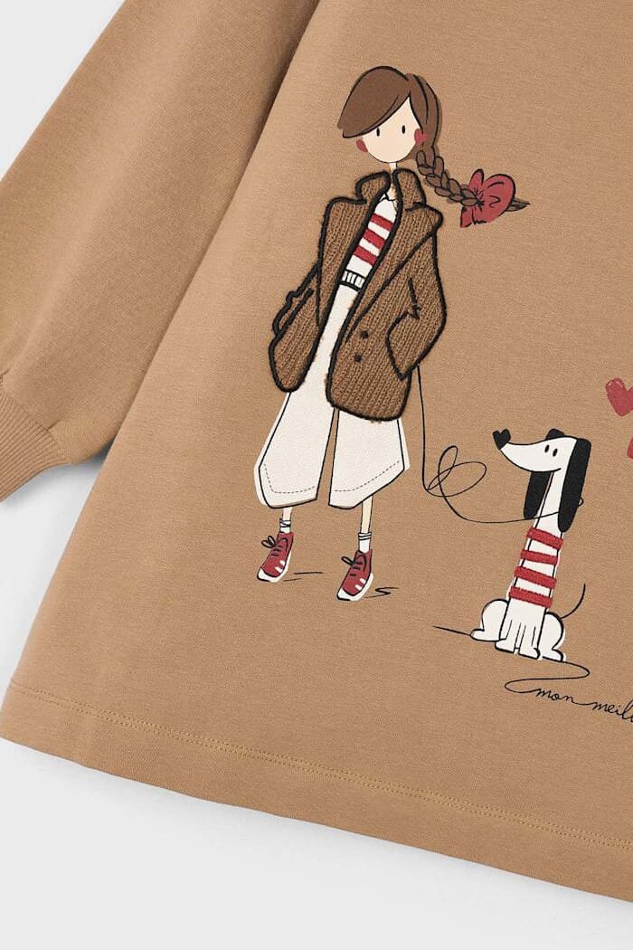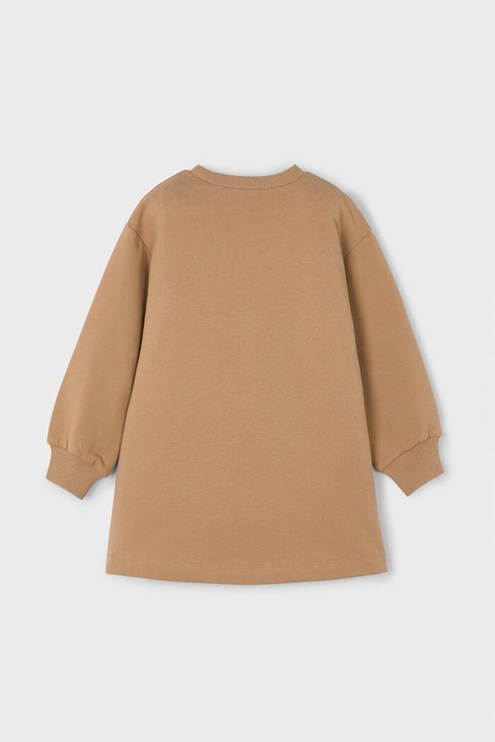 Konfor ve eğlenceli stili bir araya getiren bu sweatshirt elbise, çocukların günlük maceraları için mükemmel bir arkadaştır. Yüksek pamuk oranına sahip esnek kumaşı ve içi yumuşacık dokusu, gün boyu sıcaklık ve rahat bir kullanım sunar. Elbisenin ön yüzünü süsleyen sevimli ve stil sahibi kız ve köpek figürlü grafik baskı, tasarıma neşeli bir dokunuş katıyor. Rahat kesimi, bisiklet yakası ve ribanalı manşetleri ile klasik sweatshirt konforunu elbise şıklığıyla birleştiren bu parça, tek başına veya taytlarla kombinlenerek serin havalarda rahatlıkla kullanılabilir.