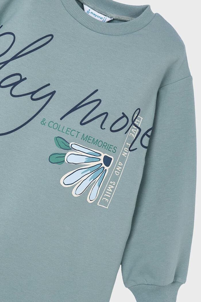 Konfor ve eğlenceli stili bir araya getiren bu sweatshirt elbise, çocukların günlük maceraları için mükemmel bir arkadaştır. Yüksek pamuk oranına sahip esnek kumaşı ve içi yumuşacık dokusu, gün boyu sıcaklık ve rahat bir kullanım sunar. Elbisenin ön yüzünü süsleyen "Play more" (Daha çok oyna) temalı, çiçek detaylı grafik baskı, tasarıma neşeli bir dokunuş katıyor. Rahat kesimi, bisiklet yakası ve ribanalı manşetleri ile klasik sweatshirt konforunu elbise şıklığıyla birleştiren bu parça, tek başına veya taytlarla kombinlenerek serin havalarda rahatlıkla kullanılabilir.