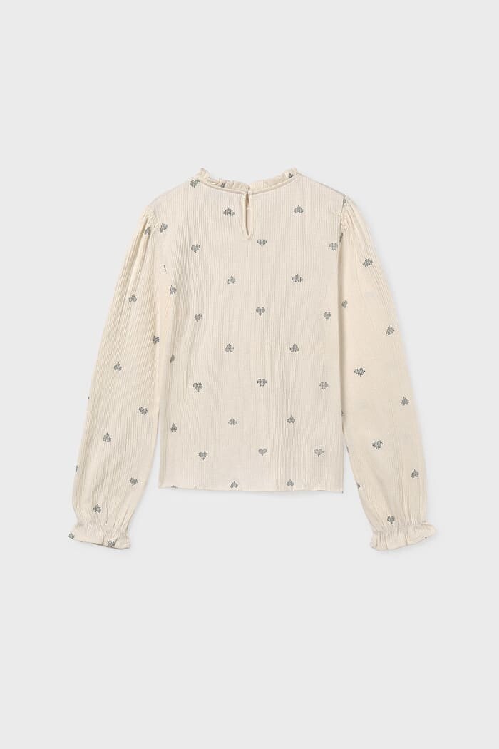 Romantik ve sevimli detaylarla tasarlanan bu bluz, miniklerin gardırobuna zarif bir dokunuş katıyor. Yüksek pamuk oranına sahip, nefes alan bürümcük dokulu kumaşı gün boyu konfor sunarken, esnek yapısı hareket özgürlüğünü destekler. Üzerini süsleyen minik kalp desenleri tasarıma neşeli bir hava katarken; fırfırlı hakim yakası ve lastikli fırfırlı kol manşetleri bluza şık ve nostaljik bir karakter kazandırır. Eteklerden pantolonlara kadar birçok parçayla kolayca kombinlenebilen bu parça, hem günlük şıklık hem de özel günler için idealdir.
