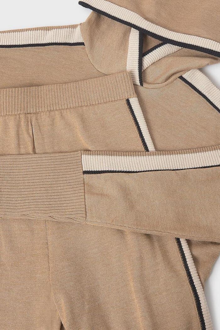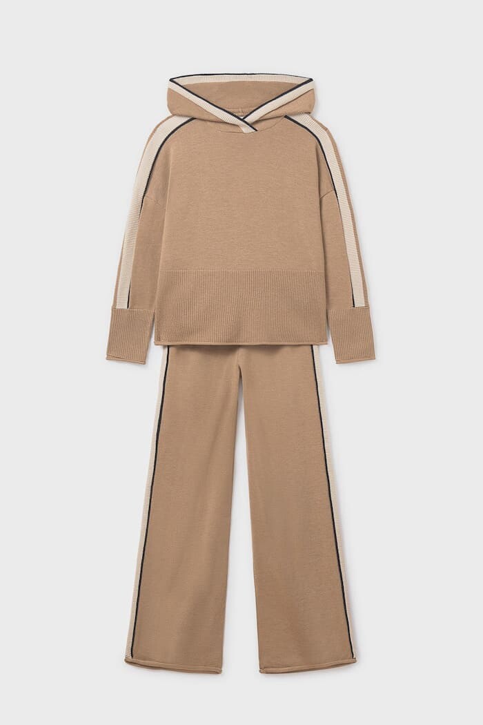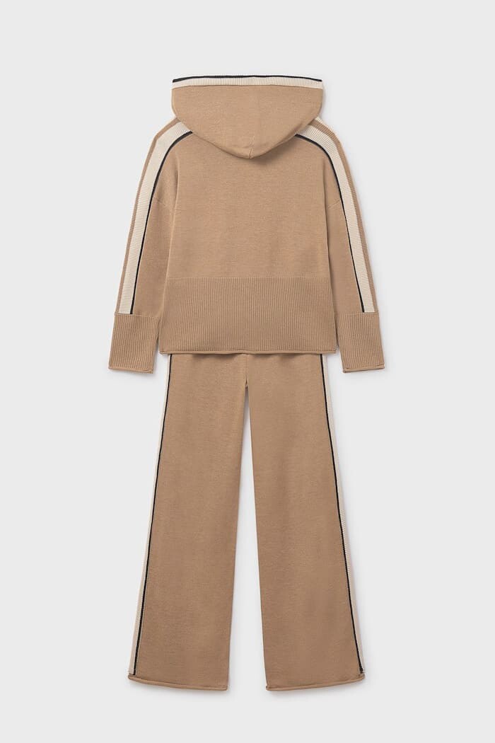 Sportif şıklığı lüks konforla birleştiren bu iki parçalı triko takım, çocukların gardırobuna modern bir dokunuş katıyor. Yumuşak, dökümlü ve pürüzsüz dokulu triko kumaştan üretilen set, bir kapüşonlu sweatshirt ve bir geniş paça pantolondan oluşur. Hem sweatshirt'ün kollarında hem de pantolonun yanlarında devam eden kontrast renkli şerit detayı, takıma dinamik ve bütüncül bir görünüm kazandırır. Rahat kesimiyle gün boyu konfor sunan bu takım, hem evde hem de dışarıda stil sahibi bir görünüm için mükemmel bir seçimdir.