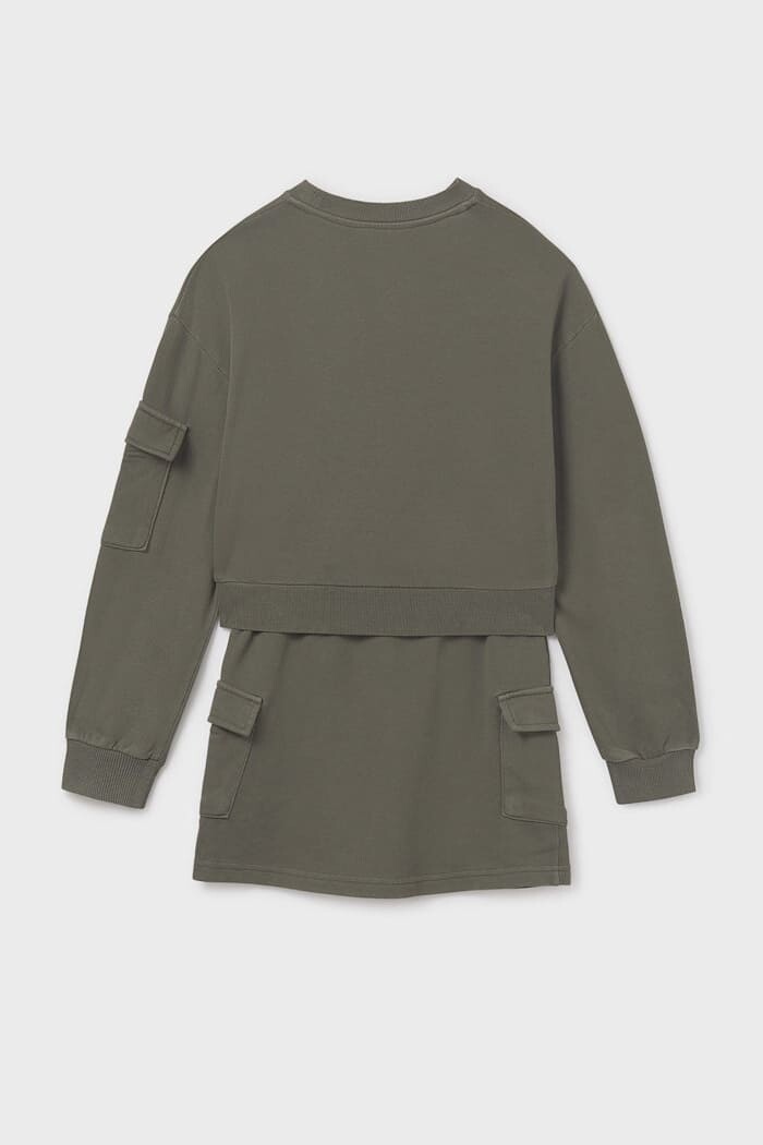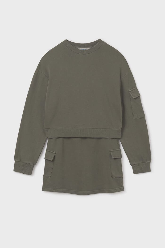 Sokak modasının en havalı trendlerini bir araya getiren bu iki parçalı takım, konfor ve stili birleştiriyor. Yumuşak pamuk karışımlı kumaştan üretilen set, kısa kesim bir sweatshirt ve kargo cepli bir etekten oluşur. Sweatshirt'ün modern kısa kesimi, yüksek belli altlarla mükemmel uyum sağlarken, eteğin yanlarındaki büyük kargo cepleri tasarıma hem fonksiyonel hem de trend bir dokunuş katıyor. İster bir arada kullanarak bütüncül bir stil yaratın, ister ayrı ayrı kombinleyerek gardırobunuza çok yönlülük katın.
