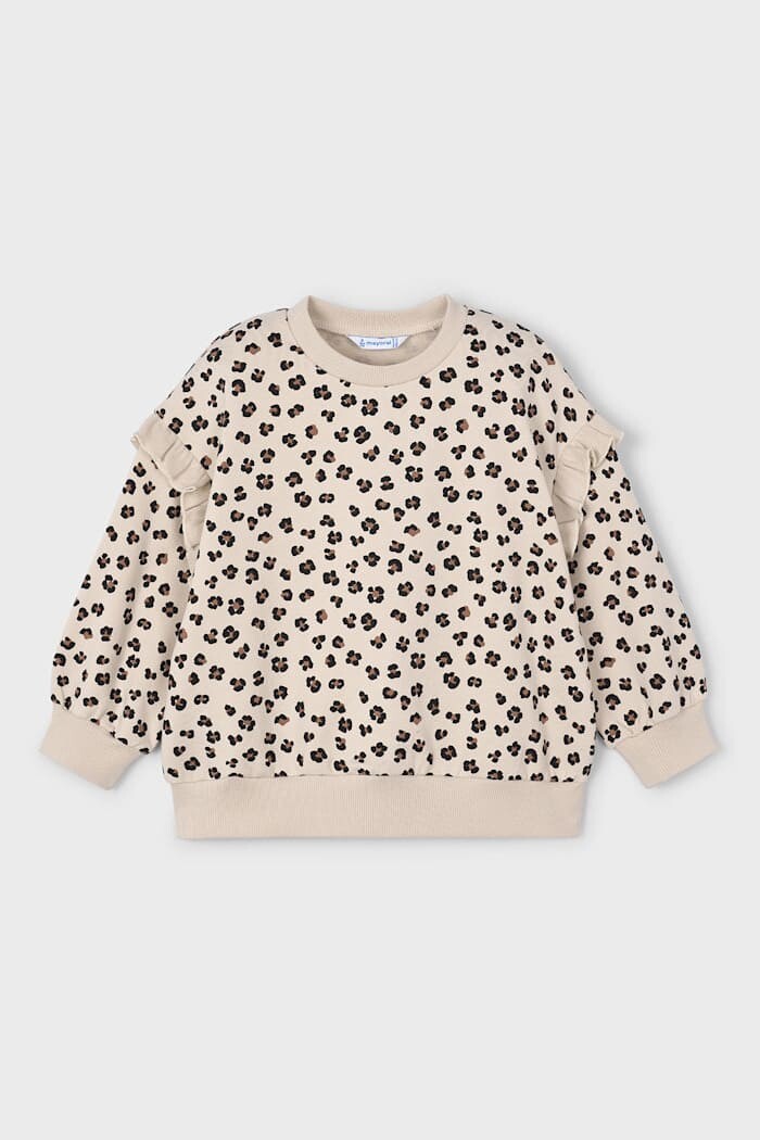 Cesur leopar desenini sevimli detaylarla birleştiren bu sweatshirt, çocukların enerjik stiline mükemmel bir şekilde eşlik ediyor. Yüksek pamuk oranına sahip esnek kumaşı, gün boyu konfor ve hareket özgürlüğü sunar. Omuzlardan kollara uzanan fırfır detayı, tasarıma eğlenceli ve feminen bir dokunuş katarken, baştan aşağı leopar deseniyle dikkat çekici bir görünüm sağlar. Rahat kesimi ve klasik bisiklet yakasıyla bu parça, jean pantolonlar veya taytlarla kolayca kombinlenerek havalı bir günlük stil yaratır.
