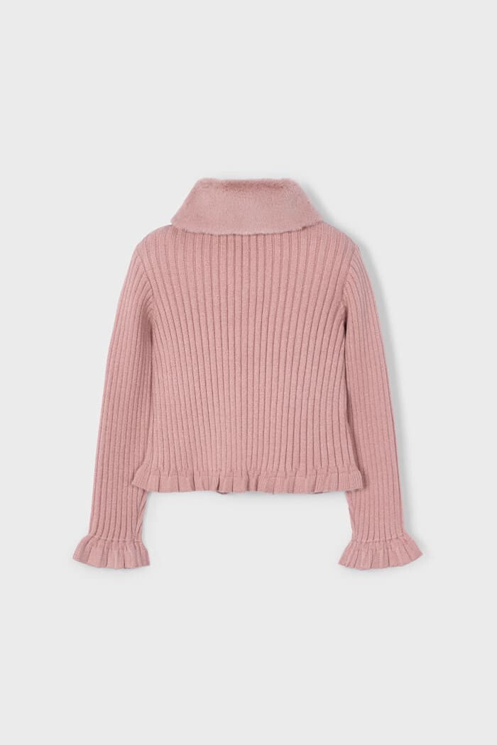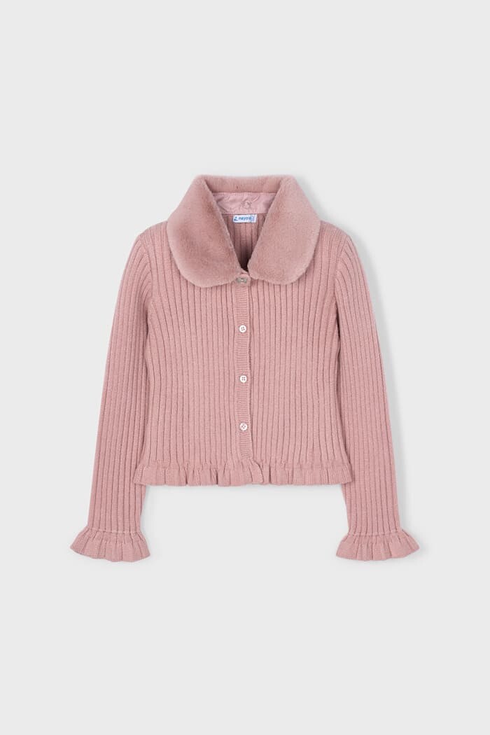 Zarafeti ve sıcaklığı bir araya getiren bu hırka, özel gün kombinlerinin en şık tamamlayıcısıdır. Vücuda oturan esnek fitilli triko kumaşı, konforlu bir kullanım sunarken, lüks ve yumuşacık suni kürk yakası tasarıma göz alıcı bir hava katıyor. Manşetlerindeki ve etek ucundaki minik fırfır detayları, hırkaya feminen ve sevimli bir dokunuş ekler. Elbiselerin ve şık bluzların üzerine giymek için ideal olan bu parça, soğuk havalarda hem sıcak tutacak hem de stili bir üst seviyeye taşıyacaktır.