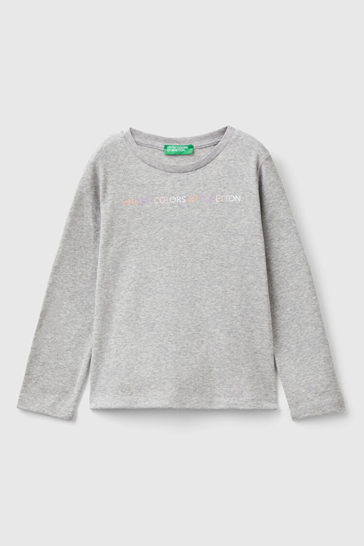 Kız Çocuk Logo Baskılı Uzun Kollu T-Shirt - Gri Melanj