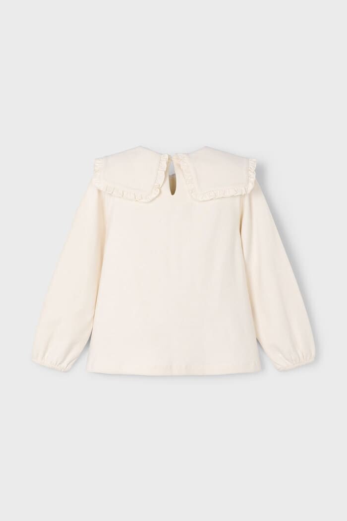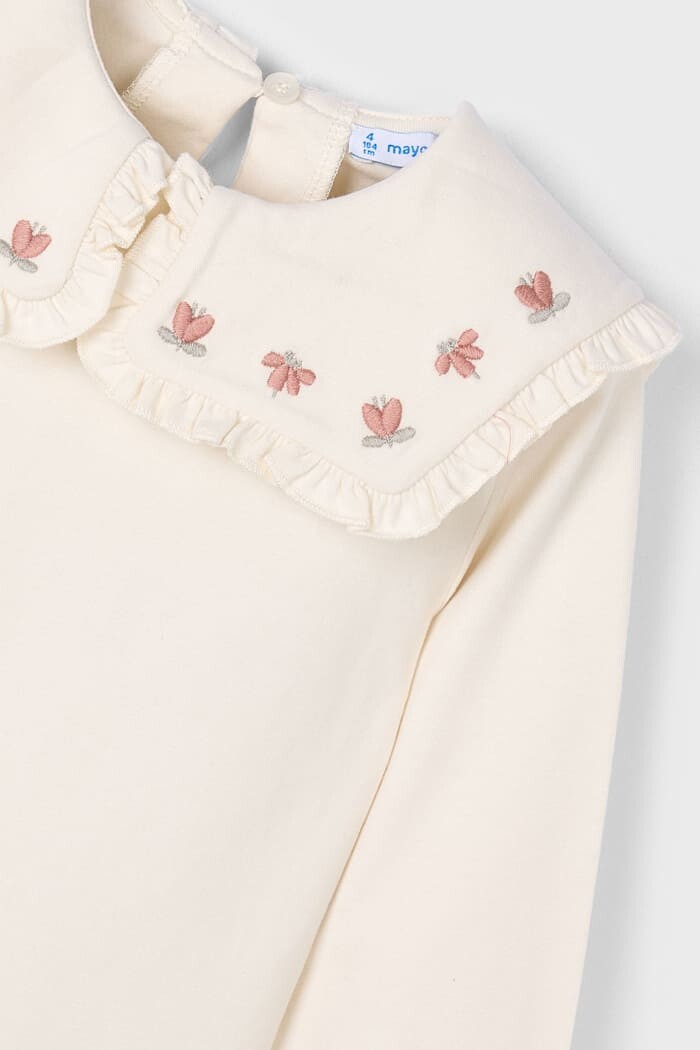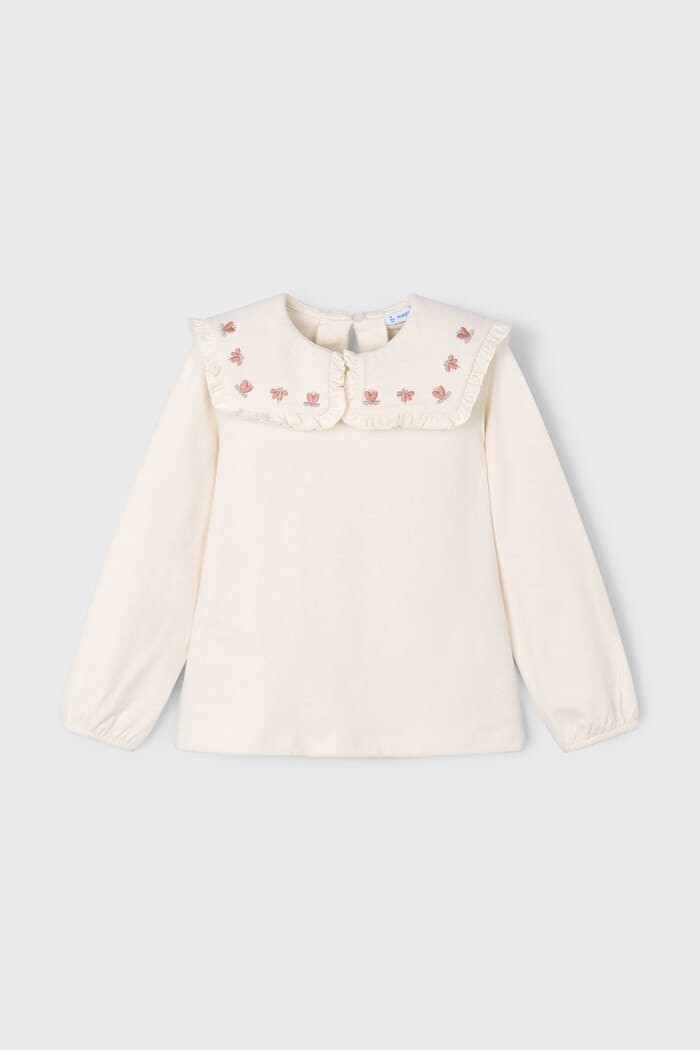 Zarif ve sevimli bir tasarıma sahip olan bu bluz, çocukların gardırobuna klasik bir dokunuş katıyor. Yüksek pamuk oranına sahip esnek kumaşı, gün boyu konforlu bir kullanım sunar. Bluzun en dikkat çekici özelliği, üzerinde incelikli çiçek nakışları bulunan geniş ve fırfırlı yakasıdır. Tek başına veya salopet elbiselerin ve kazakların içine giyilerek yaka detayını öne çıkarmak için ideal olan bu parça, her kombine sofistike bir hava katacaktır.