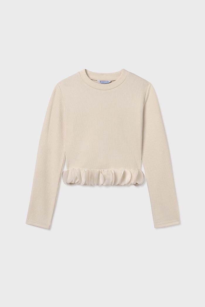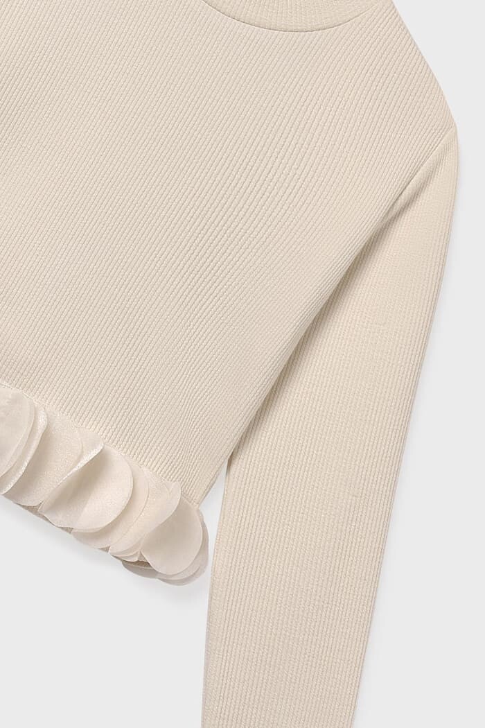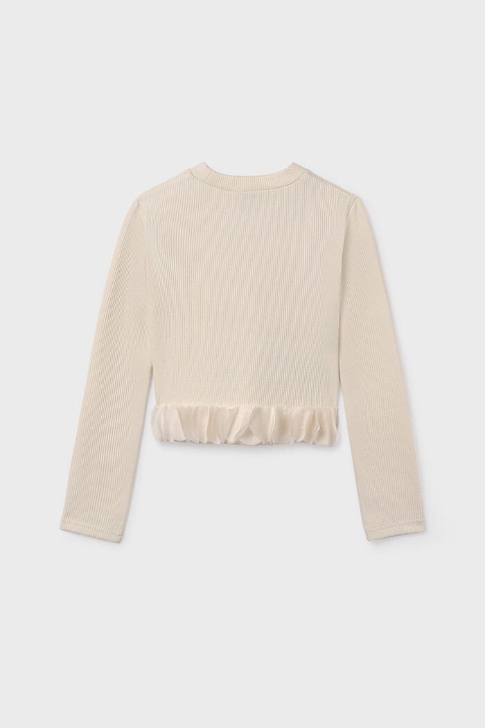 Sade şıklığı zarif bir detayla birleştiren bu triko bluz, çocukların gardırobuna modern bir dokunuş katıyor. Vücuda oturan esnek ve fitilli triko kumaşı, gün boyu konforlu bir kullanım sunarken, etek ucundaki tül volan detayı tasarıma eğlenceli ve havalı bir boyut kazandırır. Hem günlük kullanımda kot pantolonlarla hem de özel günlerde eteklerle kolayca kombinlenebilen bu parça, sade ama etkileyici bir stil yaratmak için idealdir.